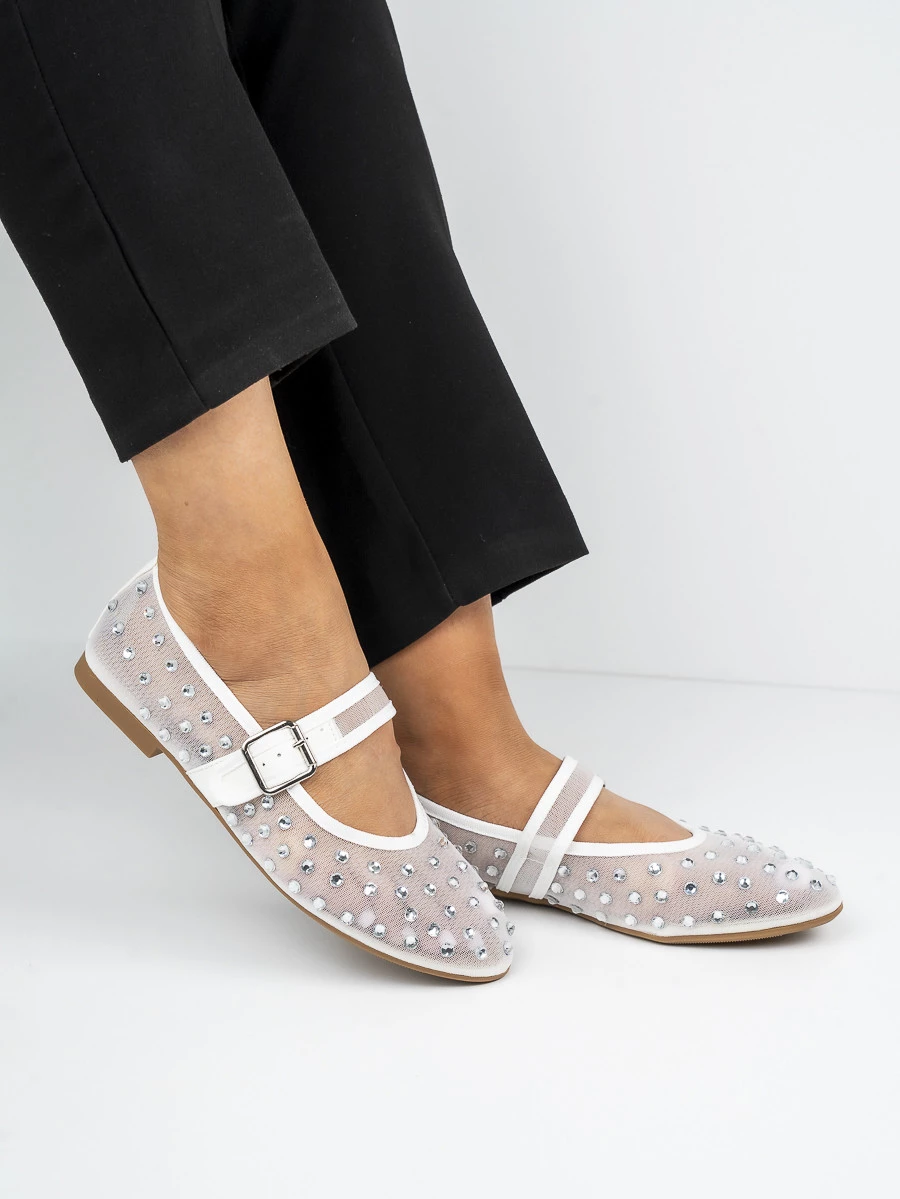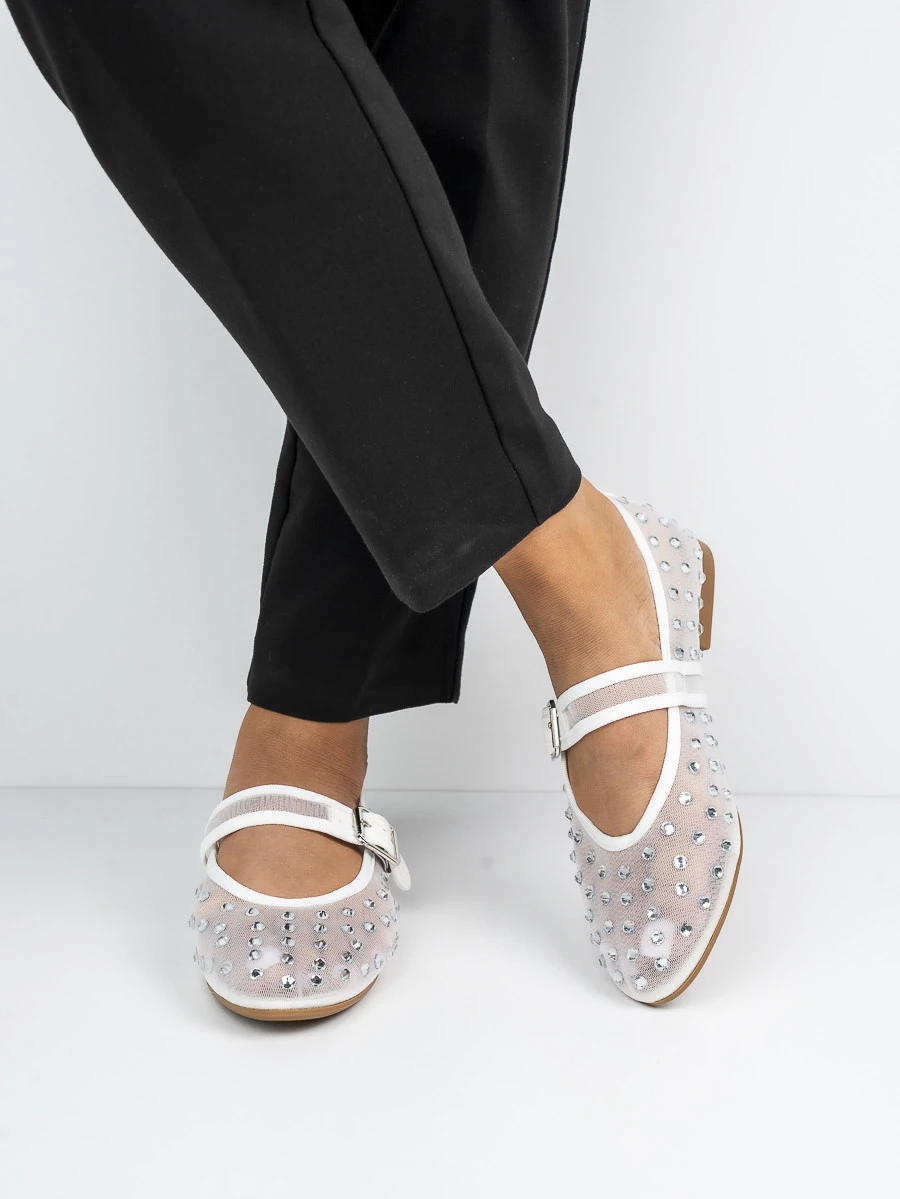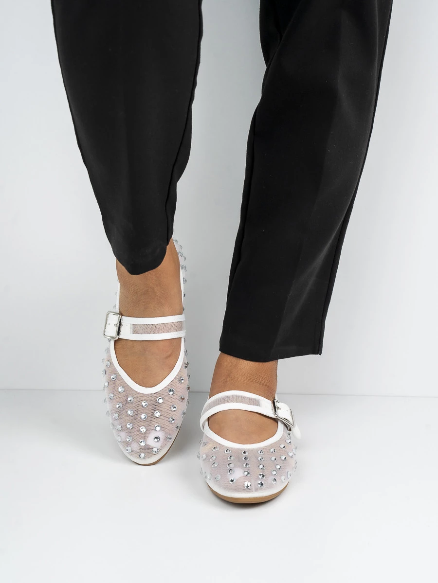 Baleriny damskie z cyrkoniami i paskiem w kolorze White
