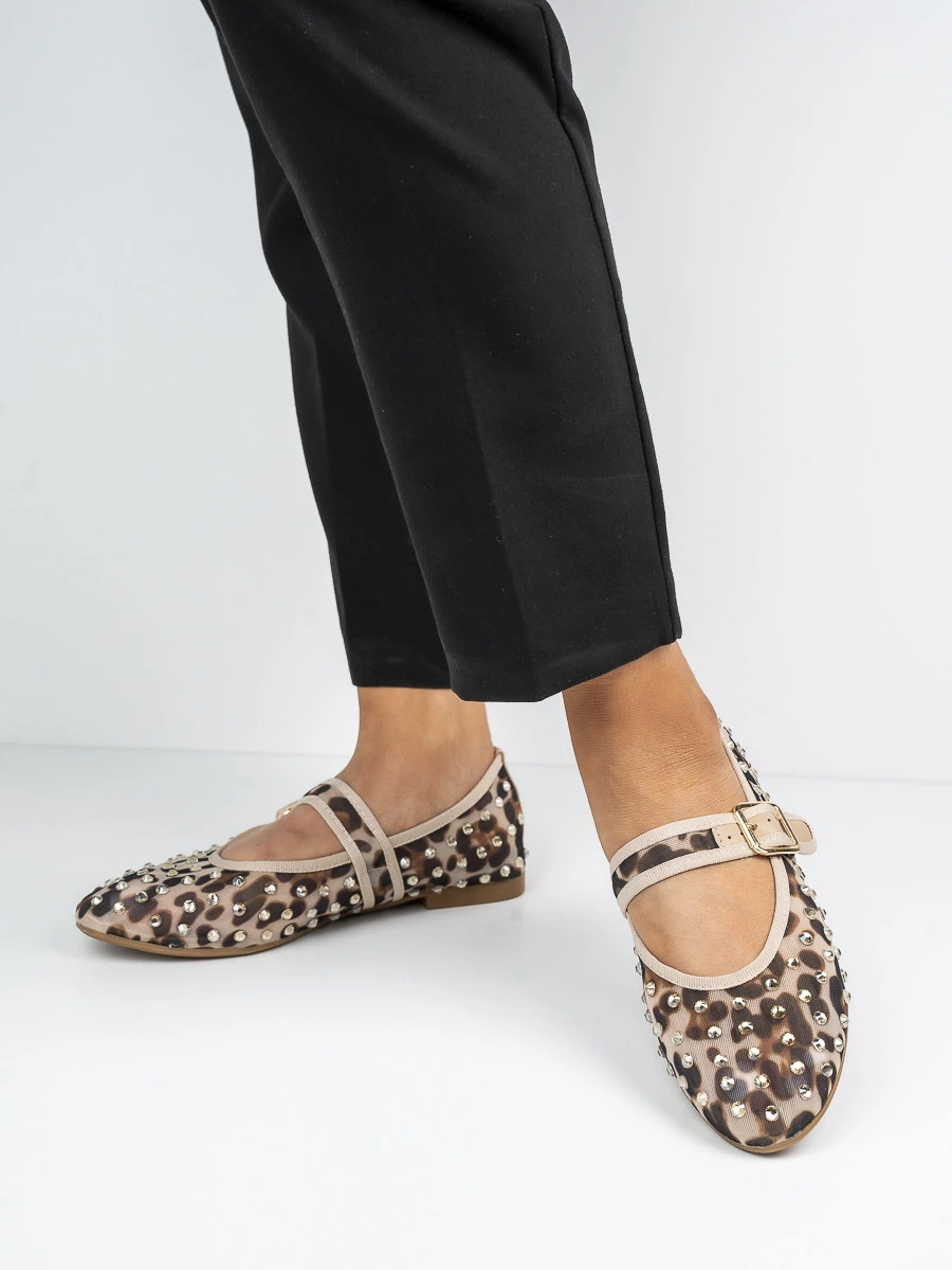 Eleganckie baleriny damskie zdobione nitami z subtelną klamrą. Wzór Leopard dodaje charakteru i stylu każdej kreacji. Idealne na co dzień i na specjalne okazje.