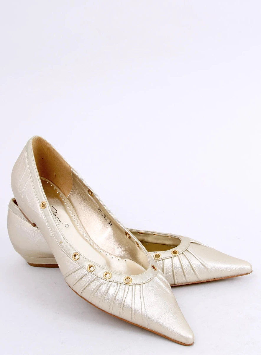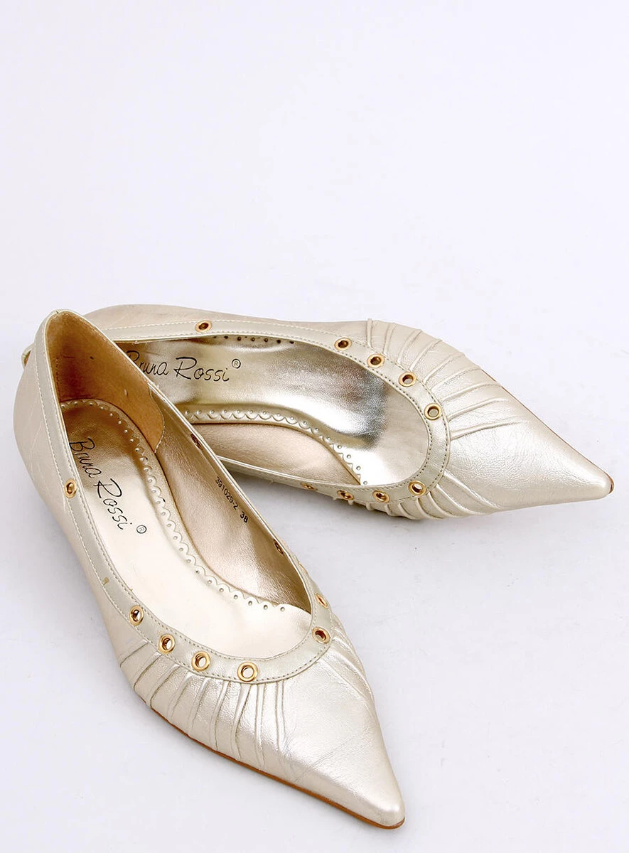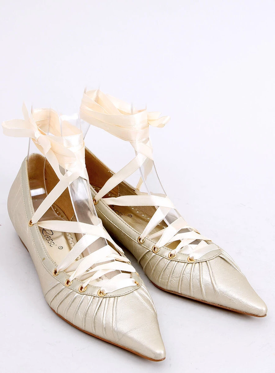 Eleganckie czółenko balerinki z noskiem w szpic. Buciki bardzo zgrabnie i ślicznie wyglądają na nodze. Mają atłasową wstążkę do zawiązania na kostce. Są bardzo oryginalne i niepowtarzalne. Model wykonany ze skóry ekologicznej w lekko metalicznym wykończeniu.