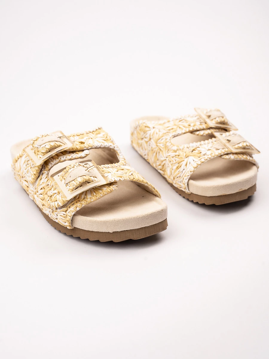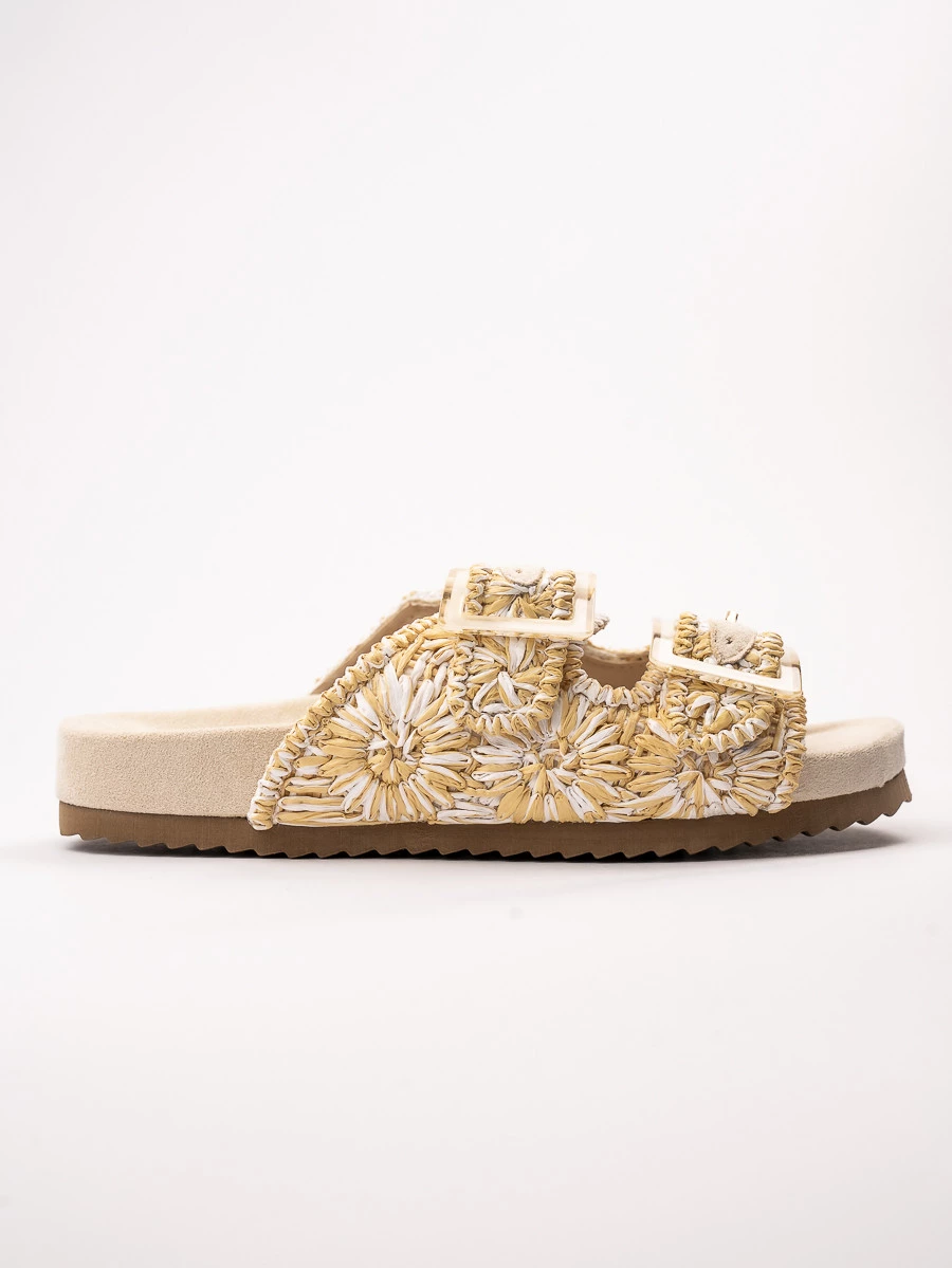 Wyróżnij się latem w tych wyjątkowych klapkach z florystycznym plecionym wzorem. Beżowa baza została ozdobiona ręcznie wyglądającym splotem w stylu boho, tworzącym efekt kwiatów w odcieniach słomy i bieli. Szerokie paski z podwójnymi klamrami zapewniają idealne dopasowanie, a gruba, miękka podeszwa amortyzuje każdy krok. Idealne na plażę, spacery i letnie stylizacje w duchu natury.