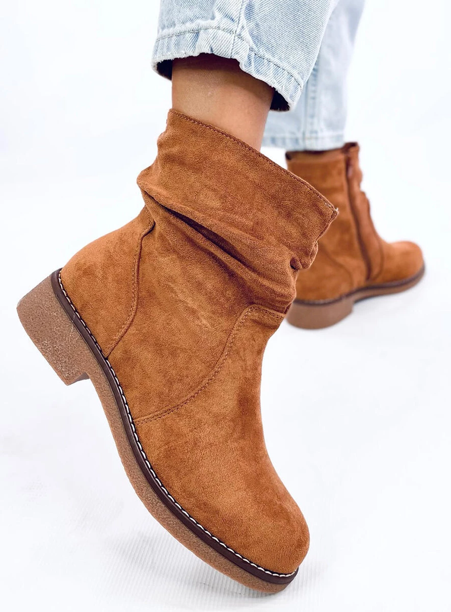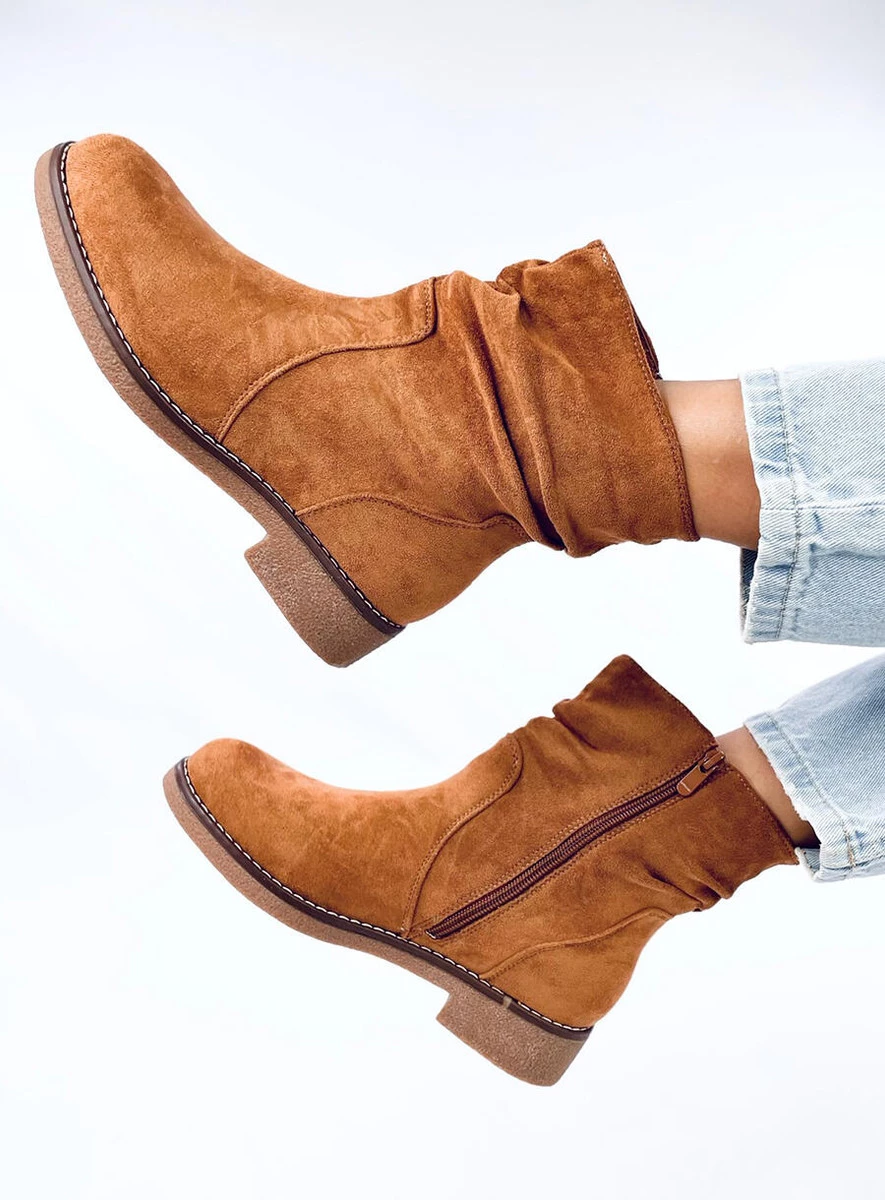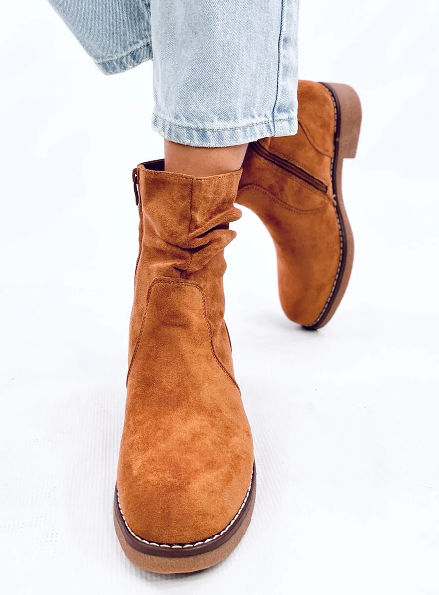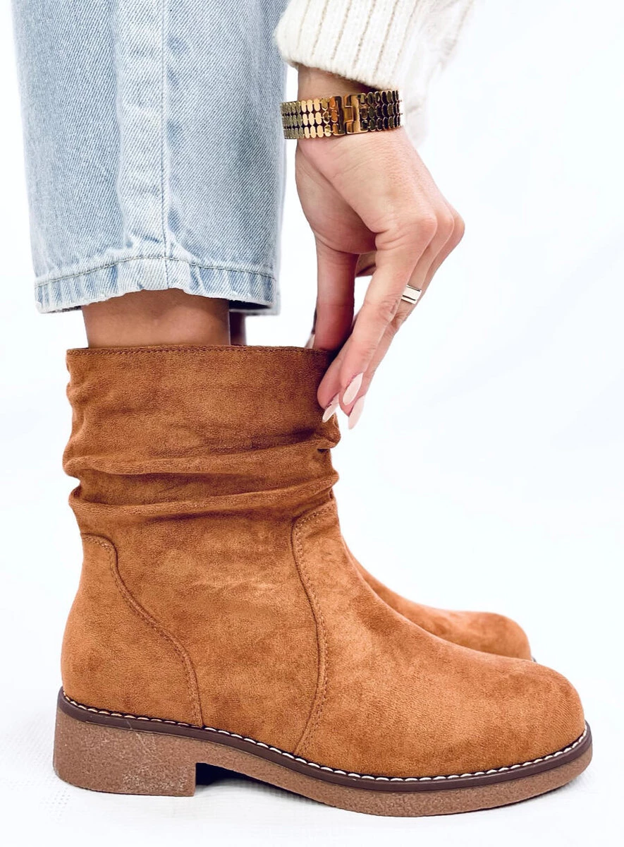 Zamszowe botki damskie na płaskiej podeszwie. Wyjątkowy urok tego modelu tkwi w jego prostym i klasycznym fasonie z modnie marszczoną cholewką. Wygodne zapięcie na zamek błyskawiczny z boku cholewki to kolejny argument, który za nimi przemawia : ) Wykonane są z zamszu ekologicznego, a wnętrze wyścielone jest delikatnym futerkiem.