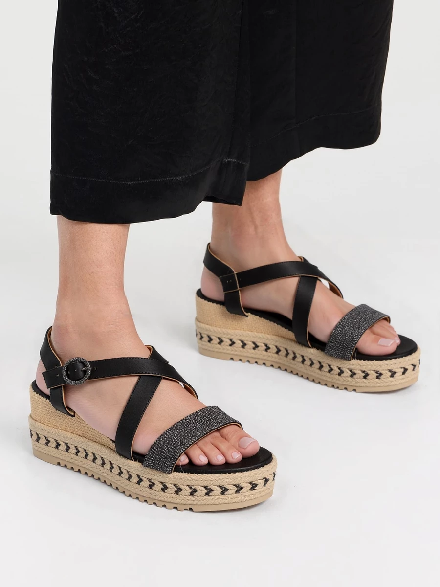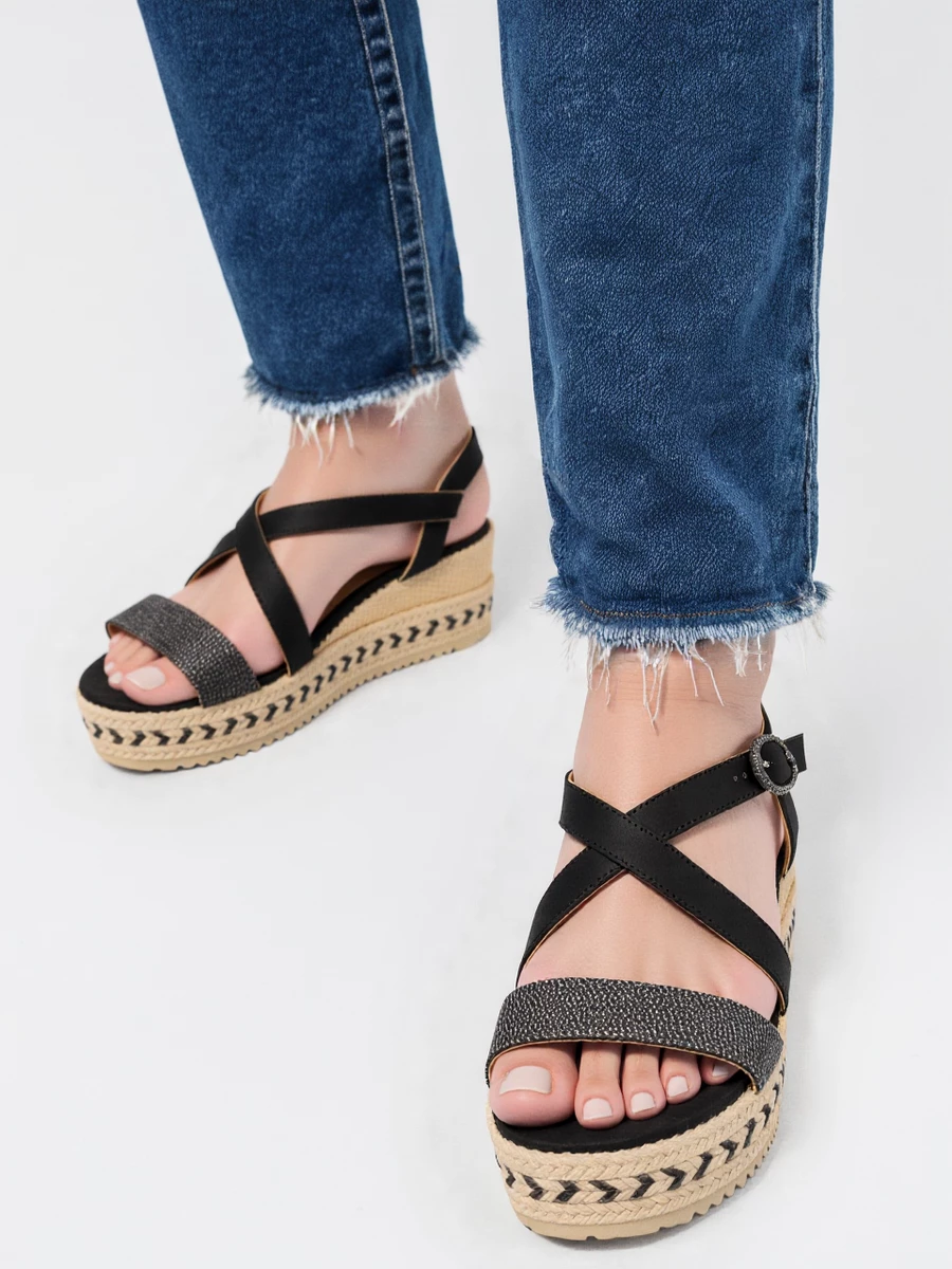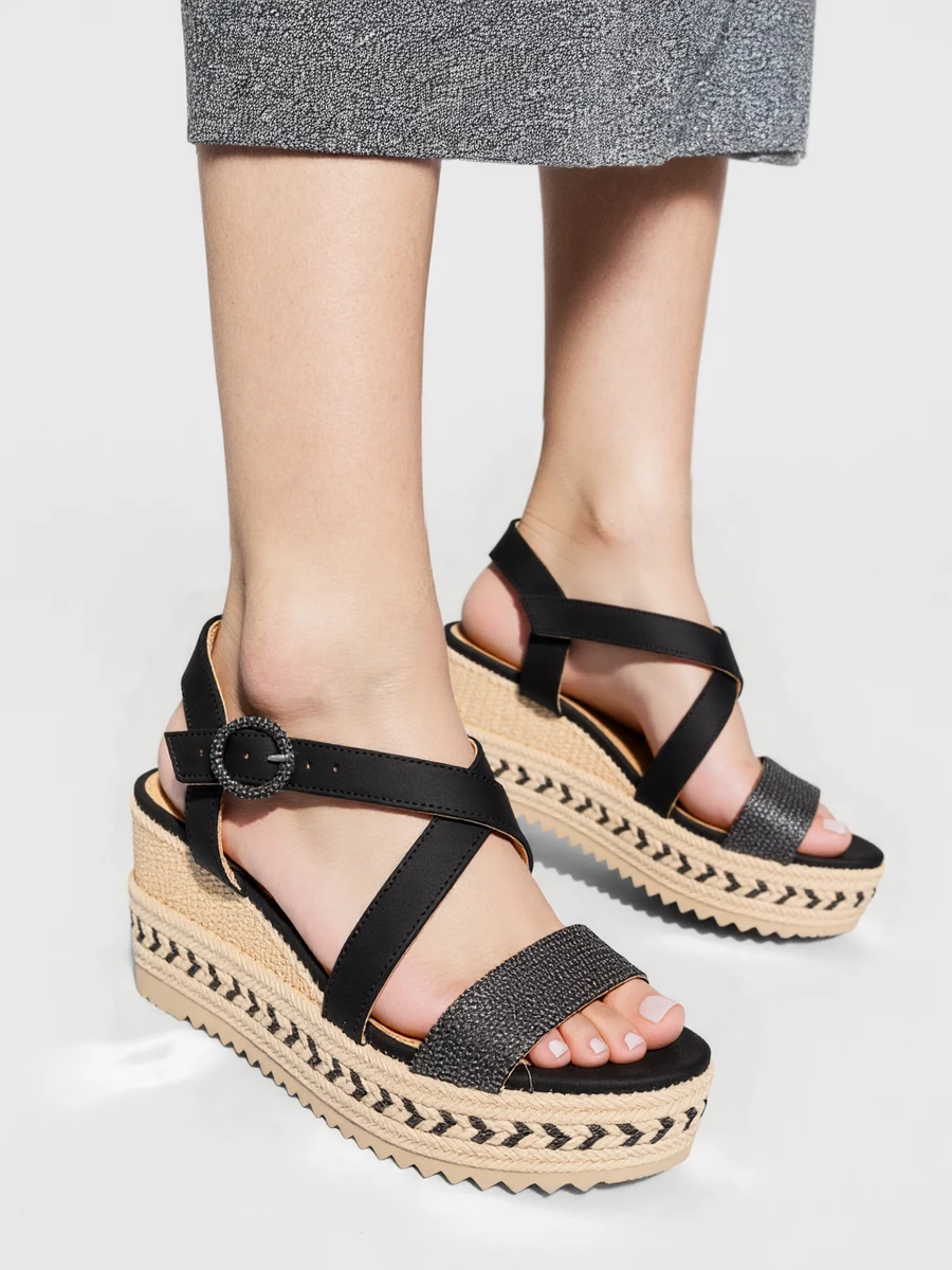 Te czarne sandały na koturnie łączą styl i wygodę. Wykonane z materiałów przypominających zamsz, z ozdobnym plecionym paskiem na przodzie oraz stabilnym koturnem ozdobionym plecionką i subtelnym zdobieniem. Regulowany pasek z klamrą pozwala na idealne dopasowanie. Doskonałe do codziennych i bardziej eleganckich stylizacji na ciepłe dni.