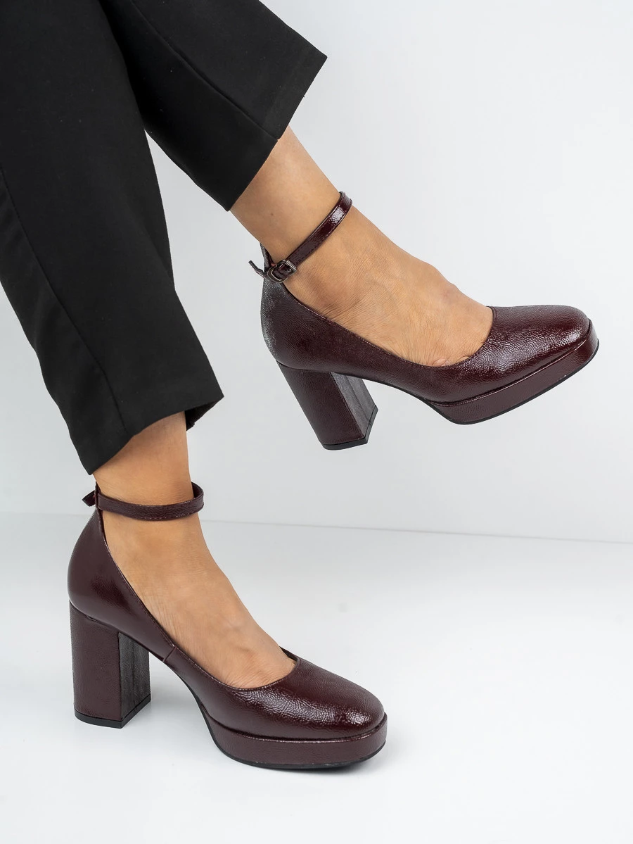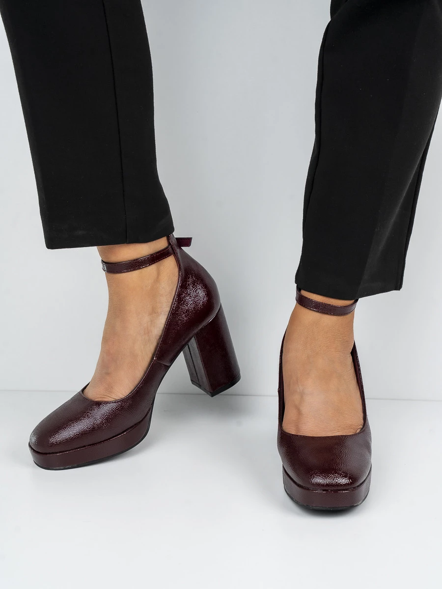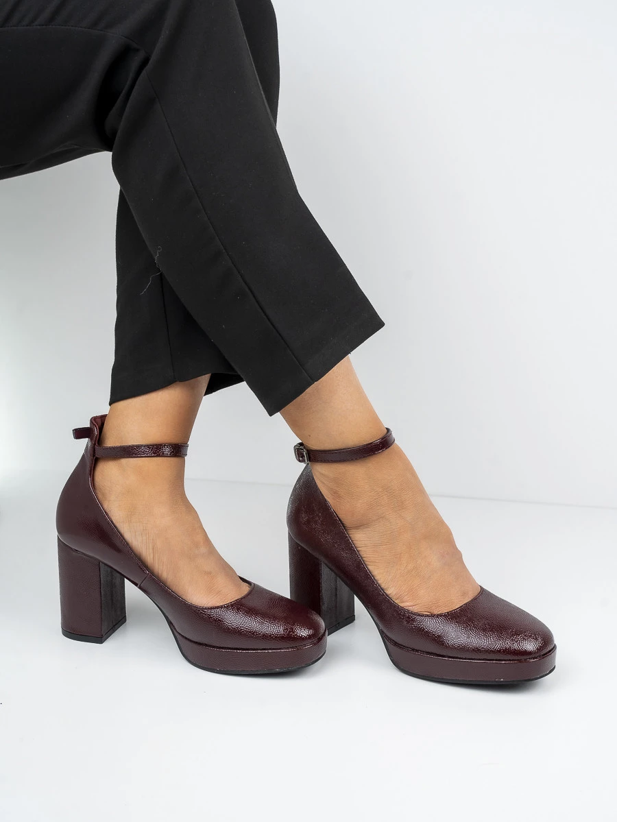 Eleganckie czółenka na obcasie w kolorze Maroon z delikatnym paskiem wokół kostki. Idealne na każdą okazję, dodają szyku każdej stylizacji. Solidny obcas zapewnia komfort i stabilność.