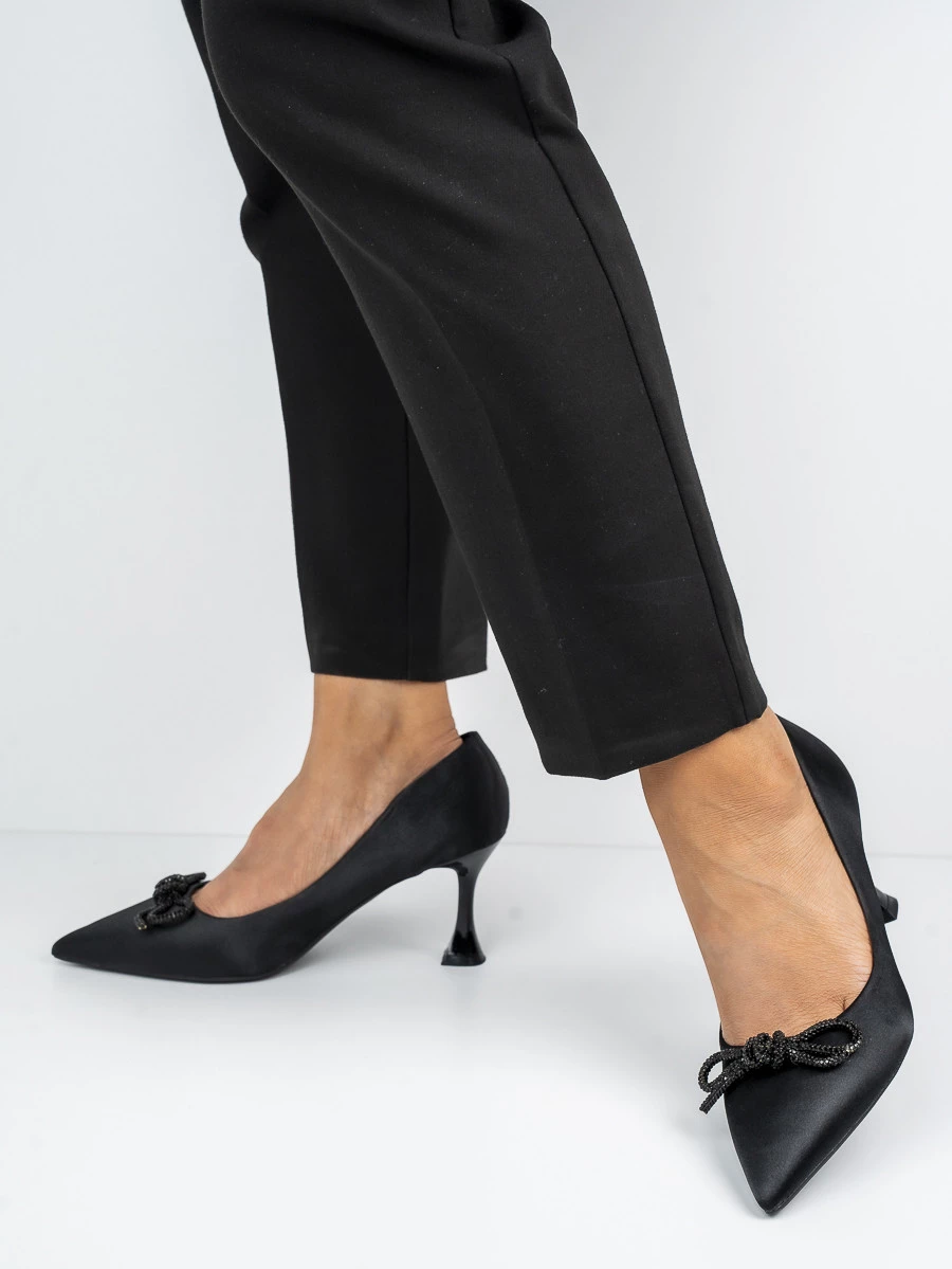 Eleganckie czółenka z ozdobnym węzłem na niskim obcasie to idealny wybór na wyjątkowe okazje. W kolorze Black, te buty dodają klasy i szyku każdej stylizacji. Zapewniają komfort dzięki stabilnemu obcasowi i miękkiej wkładce. Doskonałe do biura i na wieczorne wyjścia.