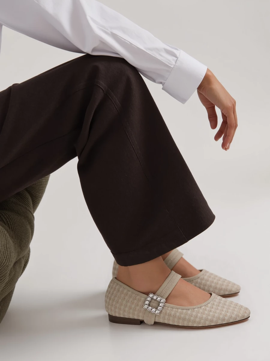 Baleriny ELIORA w beżowym kolorze to elegancka propozycja dla kobiet ceniących subtelny styl i wygodę. Wykonane z materiału o fakturze tweedu, nadają im wyjątkowego charakteru i klasy. Ozdobna klamra z kryształkami dodaje im szyku, a pasek zapewnia stabilność i komfort noszenia. Idealne zarówno do codziennych stylizacji, jak i na specjalne okazje.
