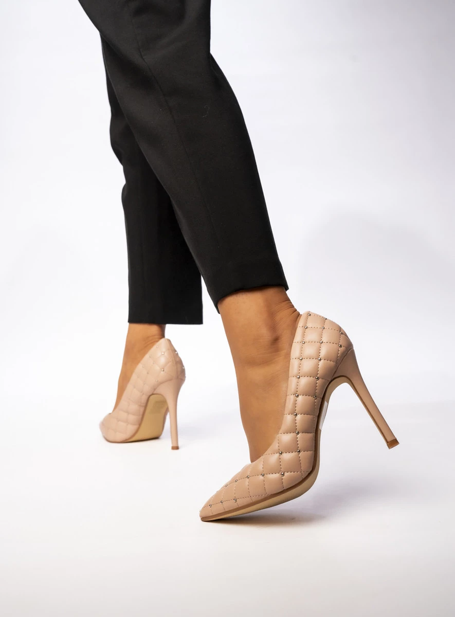 LUMORA NUDE to wyjątkowe czółenka o pikowanym wzorze z subtelnymi metalowymi zdobieniami. Ich elegancki fason i smukła szpilka sprawiają, że są idealnym wyborem na wyjątkowe okazje oraz formalne stylizacje.