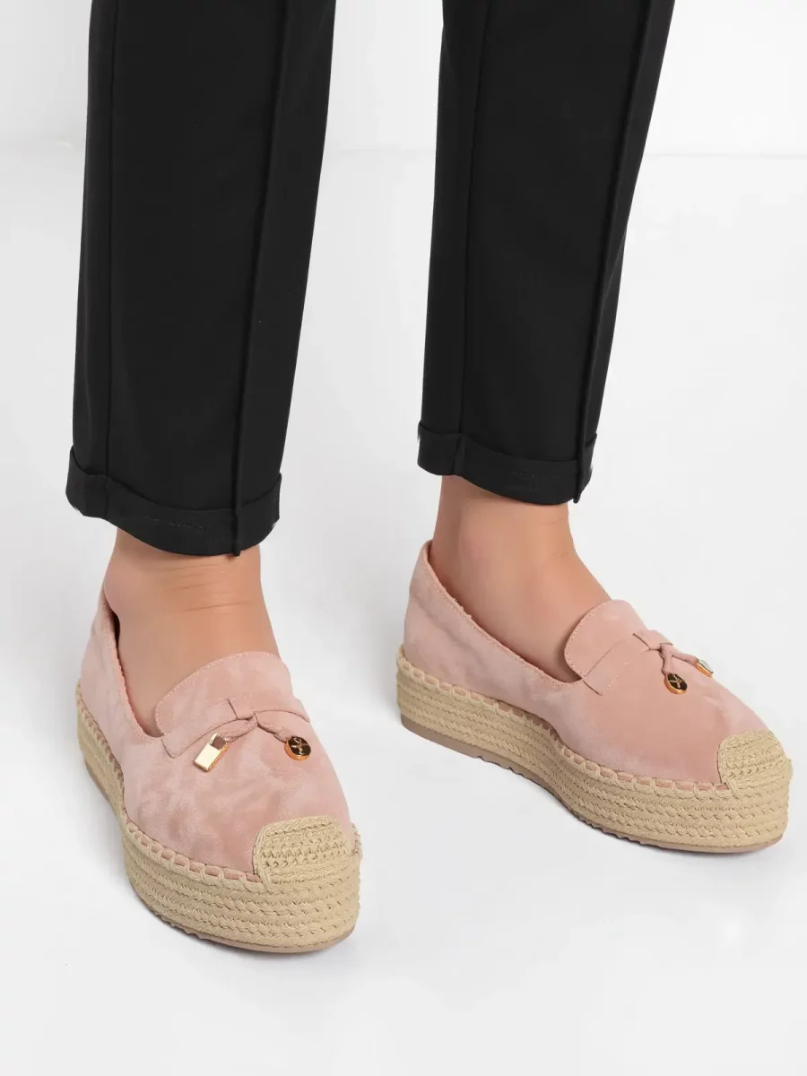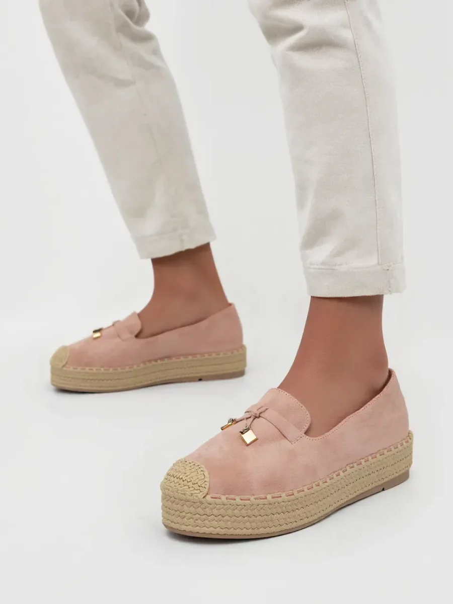 Damskie espadryle LIVORA PINK to połączenie wygody i stylowego designu. Delikatny różowy kolor w zestawieniu z klasyczną plecioną podeszwą tworzy elegancki i letni wygląd. Ozdobny złoty detal w postaci kłódki dodaje im unikalnego charakteru, sprawiając, że pasują zarówno do casualowych, jak i bardziej eleganckich stylizacji.