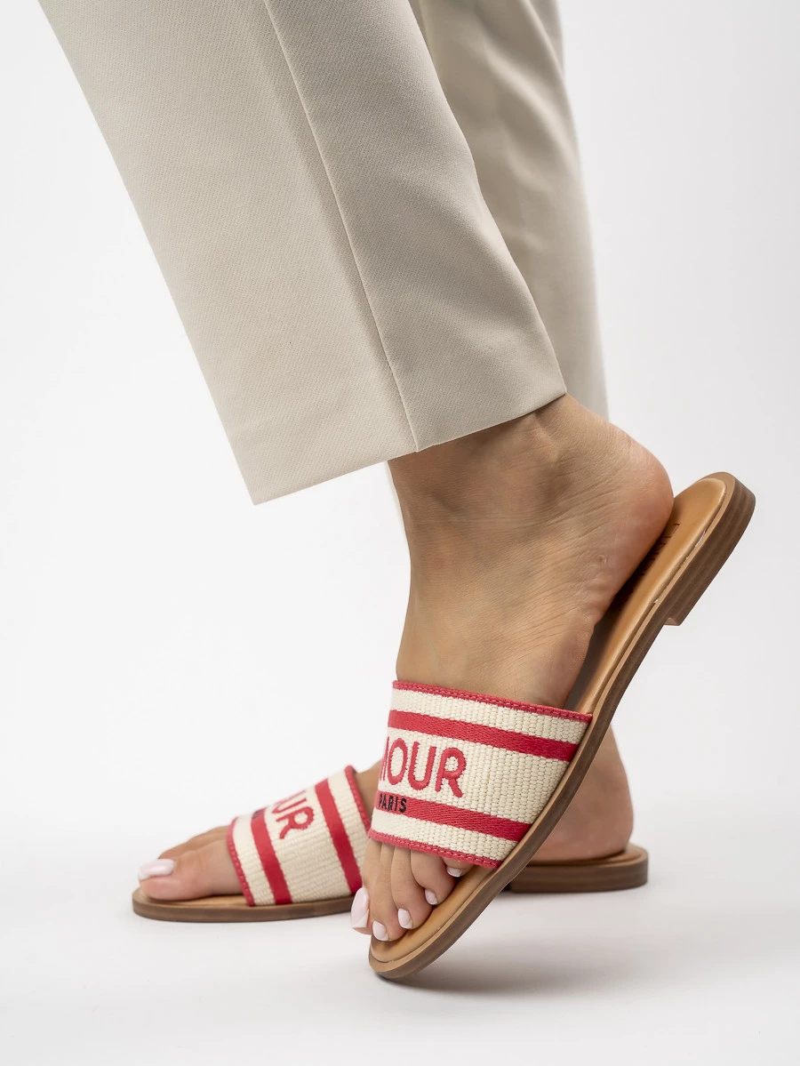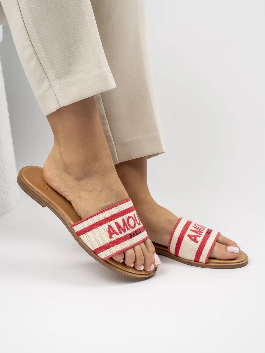 Klapki AMOUR w kolorze FUSHIA (fuksjowe) to wyrazista propozycja dla osób szukających czegoś modnego i kolorowego. Napis „AMOUR” w kontrastującym kolorze i subtelne paski nadają klapkom charakteru. Płaska podeszwa zapewnia wygodę, a ich design sprawia, że będą świetnym wyborem na letnie spacery i casualowe wyjścia.