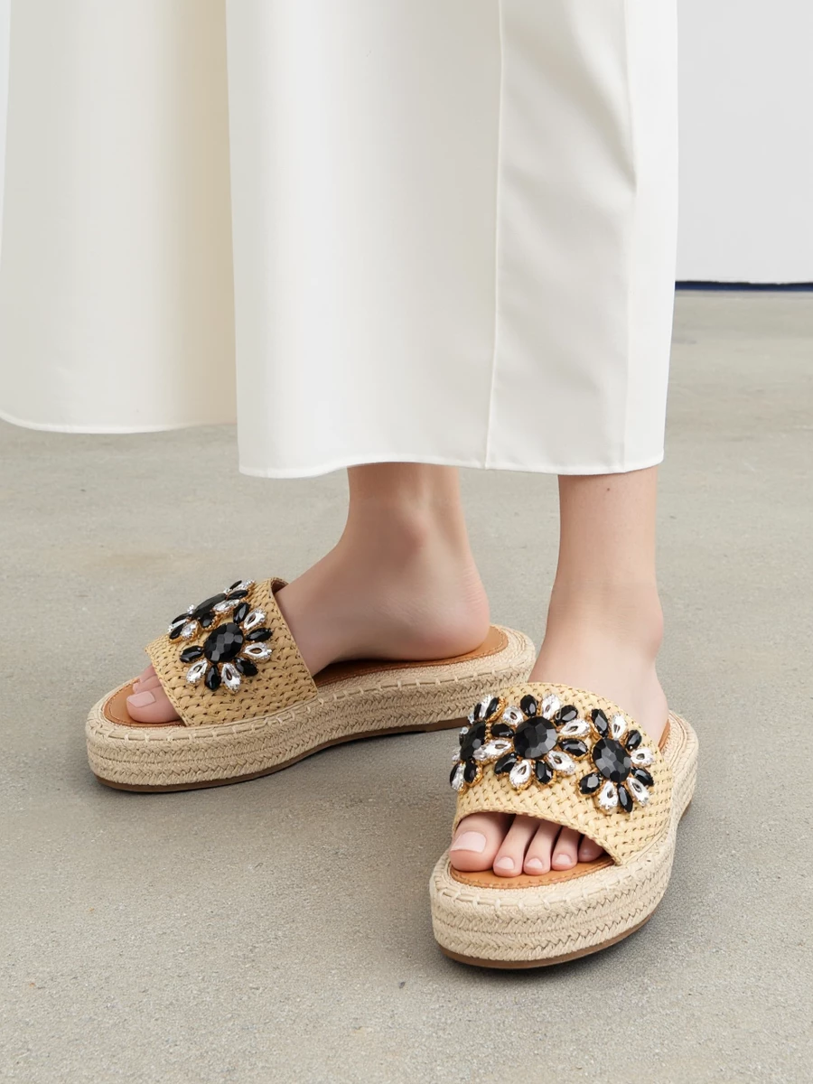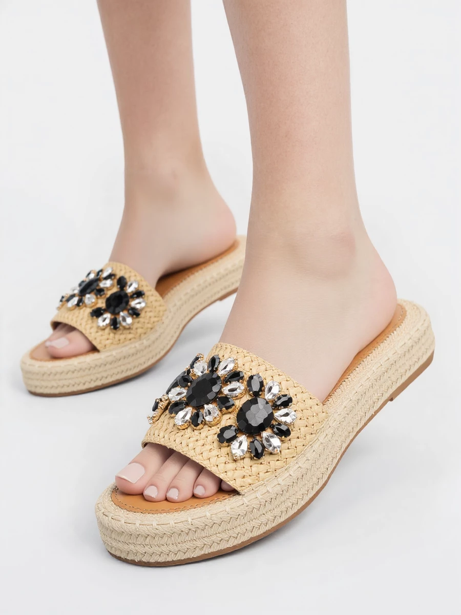 Klapki DIVAGLAM w kolorze czarnym (czarne) to połączenie elegancji z letnim stylem. Pleciona podeszwa espadrylowa zapewnia komfort i lekkość, a ozdobione kamieniami w odcieniach czerni i srebra sprawiają, że klapki nabierają wyjątkowego, eleganckiego charakteru.