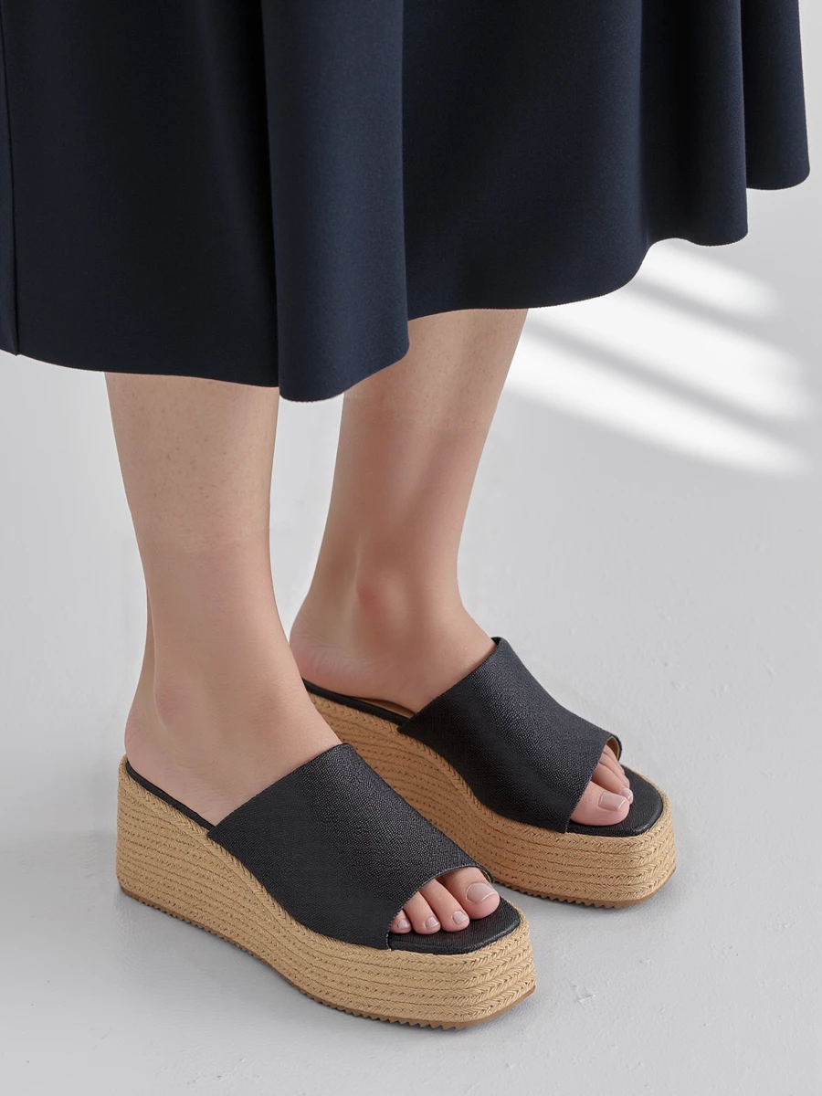 Klapki Elle w kolorze BLACK (czarnym) to doskonały wybór na wiosnę i lato. Model wykonany z wysokiej jakości materiałów, zapewniający komfort noszenia przez cały dzień. Górna część buta została wykonana z materiału przypominającego tkaninę, co nadaje im subtelnego, eleganckiego wyglądu. Podeszwa z juty nadaje im naturalny charakter, a platforma zapewnia wygodę i stabilność w trakcie chodzenia.