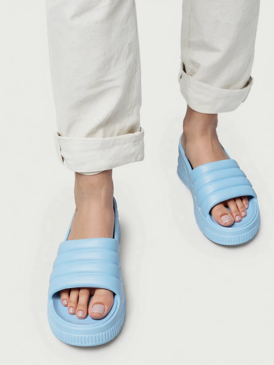 Klapki NOVA w kolorze niebieskim (BLUE) to nowoczesne sandały na lekkiej koturnie, które zapewniają wygodę i modny wygląd. Dzięki wyprofilowanej podeszwie i otwartemu designowi, buty gwarantują komfort i stabilność podczas codziennych spacerów. Ich strukturalna konstrukcja, z trzema wyraźnymi paskami, dodaje im wyjątkowego charakteru, a niebieski kolor wprowadza świeży, letni akcent. Koturna wysokość zapewnia subtelną elegancję, jednocześnie podnosząc komfort użytkowania.