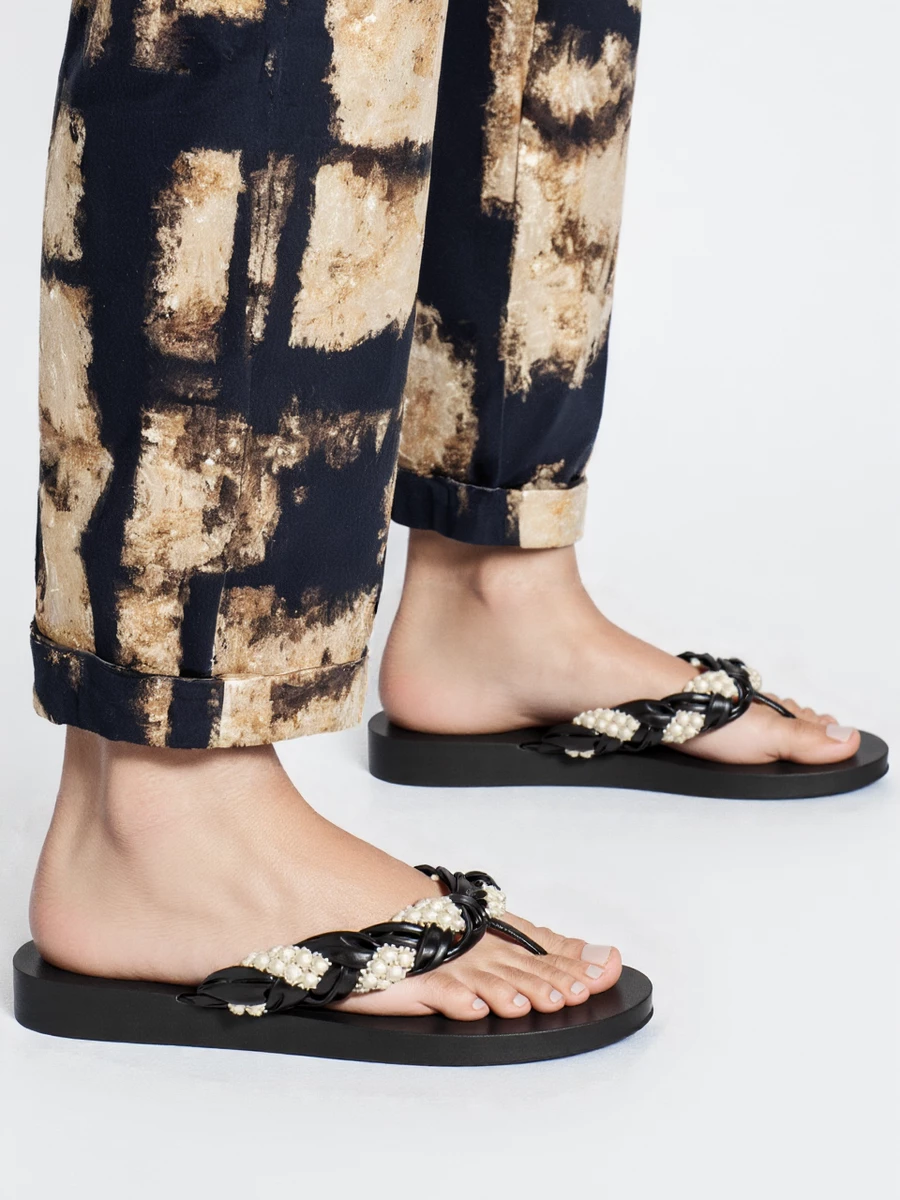 Klapki PEARLSTEP w kolorze czarnym (czarne) to elegancka propozycja na ciepłe dni. Charakteryzują się subtelnymi perłami ozdabiającymi pasek, które nadają im wyjątkowego charakteru. Wygodna, płaska podeszwa zapewnia komfort noszenia, a stylowy design sprawia, że doskonale pasują do letnich stylizacji na plażę lub spacer.