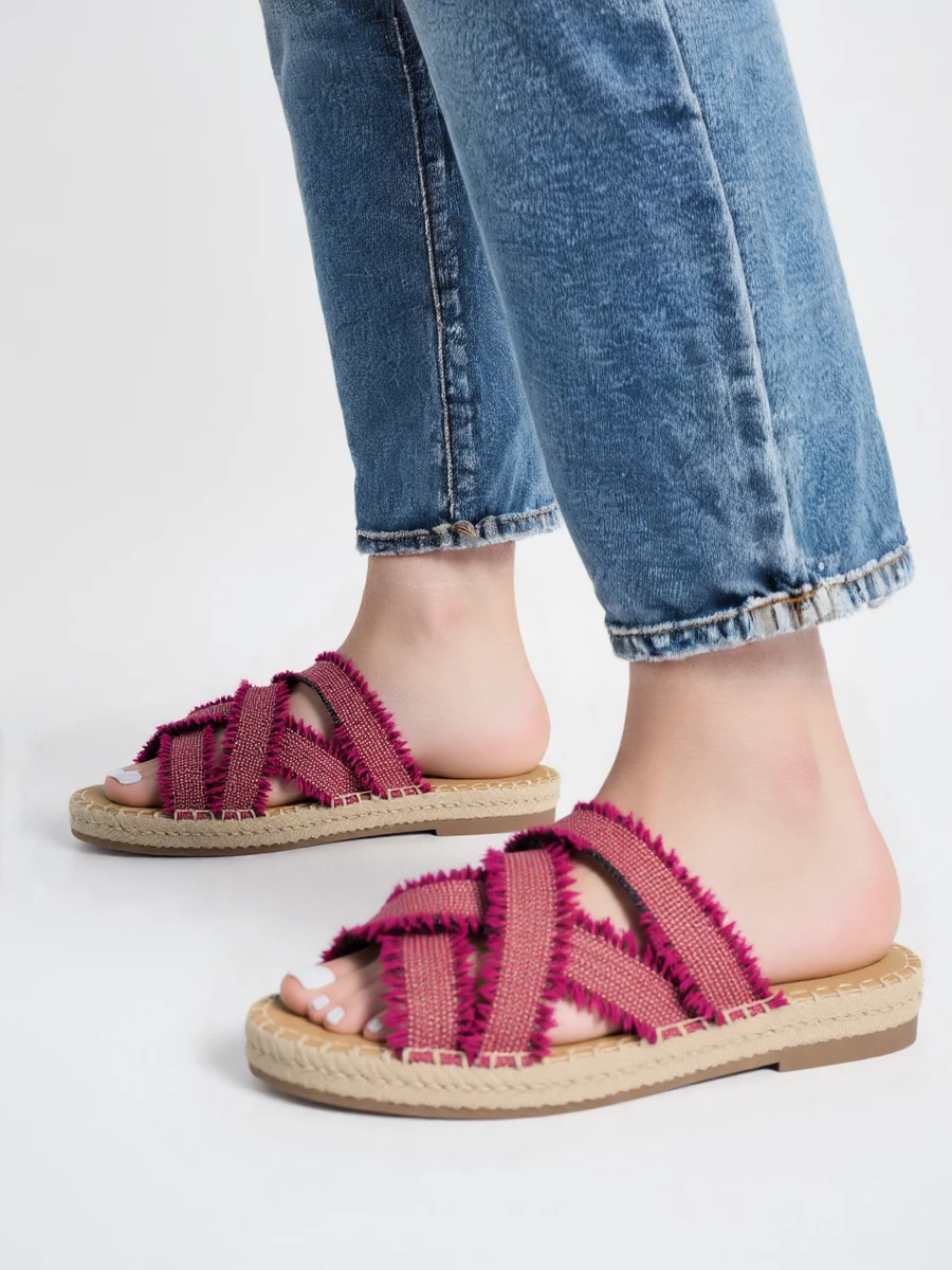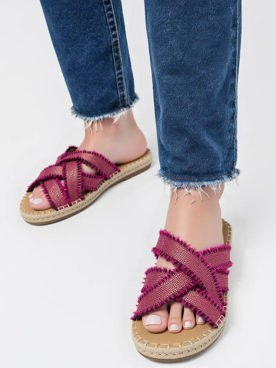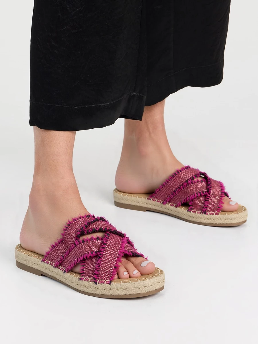 Kolorowe, tekstylne sploty, boho vibe i plażowa energia – TROPI PEACH to klapki, które od razu przenoszą Cię w letni nastrój. Ich krzyżujące się paski w odcieniach różu przyciągają wzrok, a podeszwa z plecionką przypominającą espadryle dodaje lekkości i luzu.