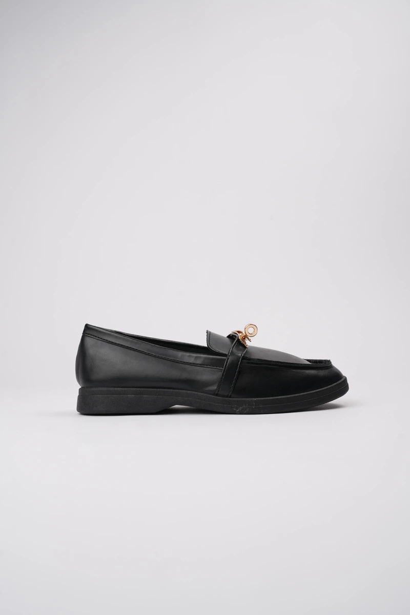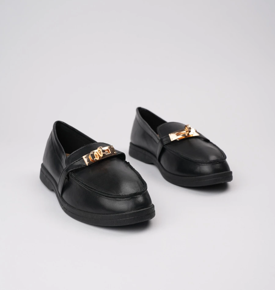 Damskie loafersy ALDEN BLACK to klasyka, która nigdy nie wychodzi z mody. Wykonane z gładkiej ekoskóry w głębokim, czarnym odcieniu i ozdobione eleganckim złotym detalem, prezentują się stylowo i profesjonalnie. Kontrastowa biała podeszwa dodaje im lekkości i miejskiego charakteru, a płaski fason zapewnia komfort przez cały dzień. Idealne do pracy, na spotkania i na co dzień – do jeansów, cygaretek czy sukienek.