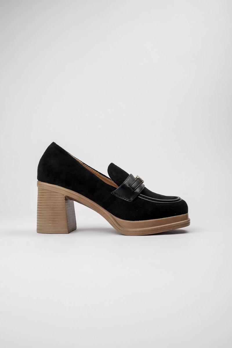 Damskie Loafersy LUX CLASSY BLACK to esencja miejskiej elegancji z nutą nowoczesności. Cholewka z miękkiego, czarnego zamszu ekologicznego została ozdobiona błyszczącą, złotą klamrą, która dodaje butom wyrafinowanego charakteru. Stabilny, karmelowy obcas na słupku zapewnia komfort chodzenia i świetnie komponuje się z całością. Idealne do pracy, na spotkania i do codziennych stylizacji.