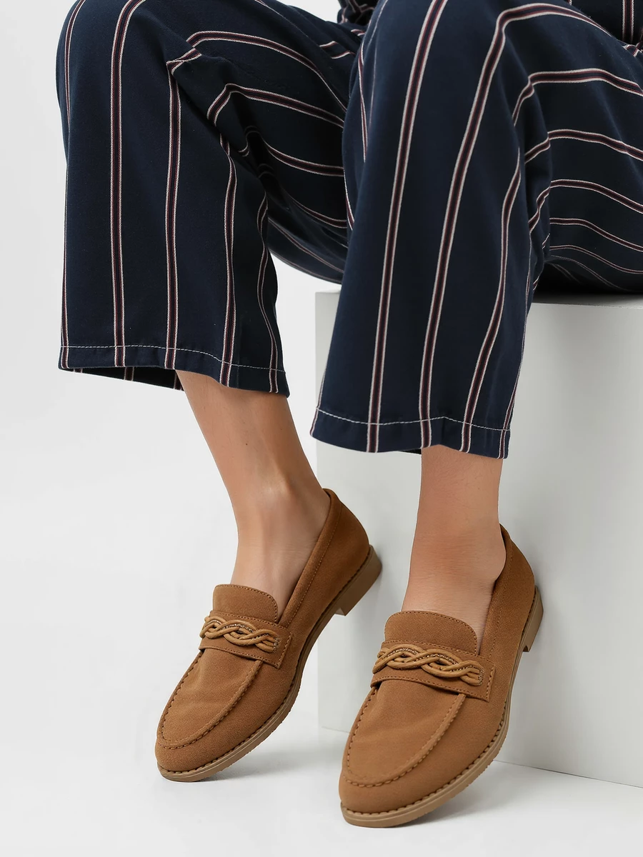 Damskie loafersy ROCHE CAMEL to idealne połączenie codziennego komfortu i naturalnej elegancji. Cholewka wykonana z ekologicznego zamszu w odcieniu karmelu wyróżnia się ozdobnym, plecionym elementem, który subtelnie przyciąga wzrok. Klasyczna, wsuwana forma i niska, płaska podeszwa zapewniają wygodę podczas całodziennego użytkowania – zarówno w pracy, jak i podczas spacerów po mieście.