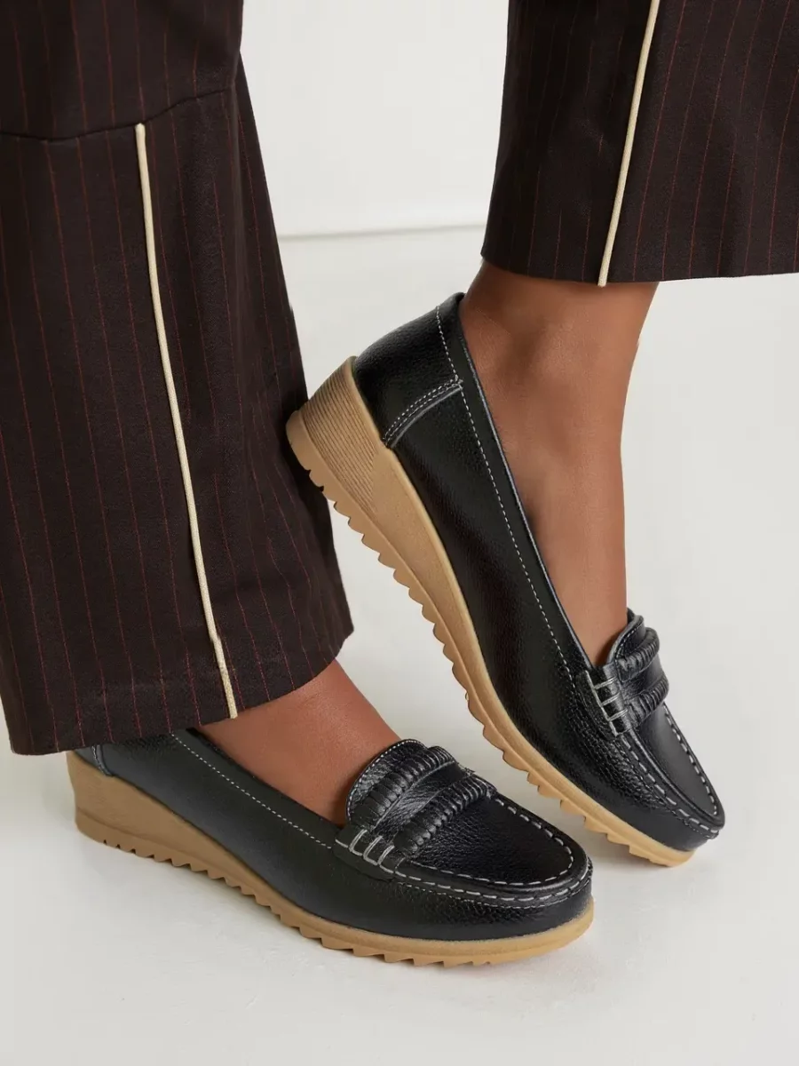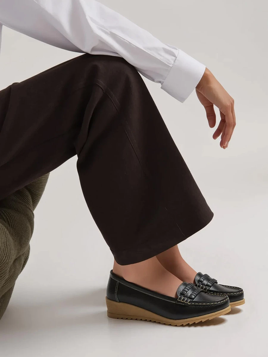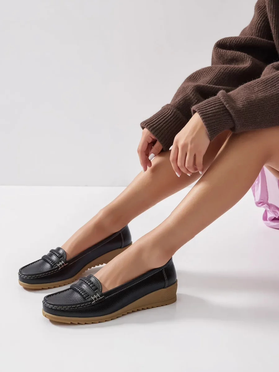 Damskie mokasyny ALORA BLACK to klasyczna i ponadczasowa propozycja dla kobiet ceniących komfort oraz elegancki wygląd. Czarna cholewka z ekoskóry doskonale komponuje się z jasnobrązową gumową podeszwą, tworząc stylowy kontrast. Perforowane detale oraz subtelne przeszycia dodają im wyjątkowego charakteru. Wsuwane, wygodne i lekkie – idealne na każdą okazję.