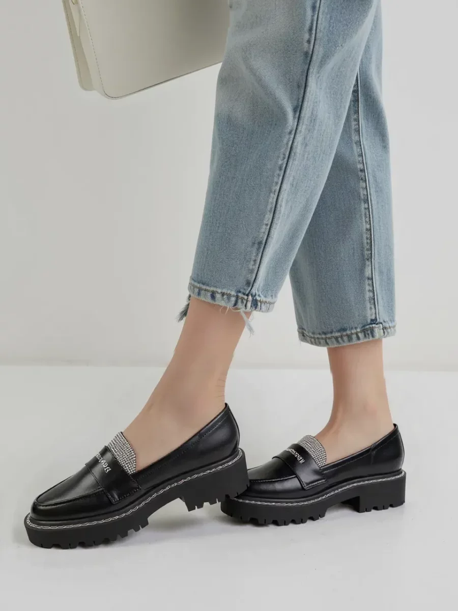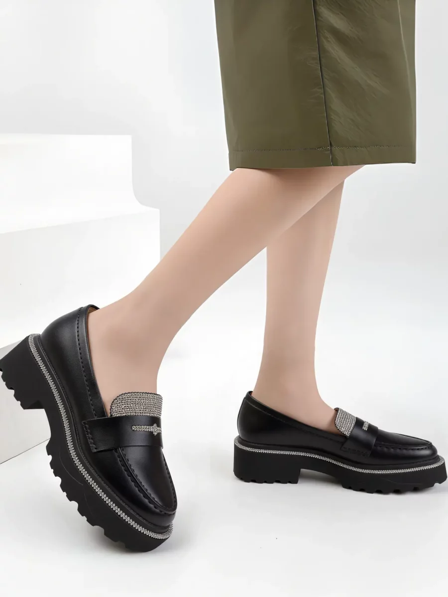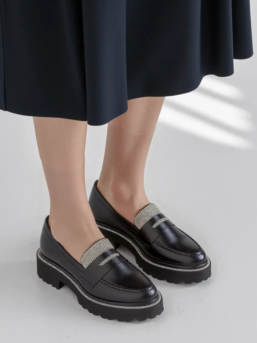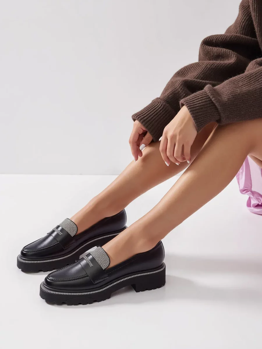 Stylowe damskie mokasyny DIAMANT BLACK to idealne połączenie klasyki i nowoczesnego designu. Ich elegancka, czarna kolorystyka sprawia, że pasują zarówno do codziennych stylizacji, jak i bardziej formalnych okazji. Wykonane z wysokiej jakości skóry ekologicznej, posiadają subtelne zdobienia z kryształkami, które dodają im wyjątkowego charakteru. Solidna, grubsza podeszwa zapewnia komfort i stabilność podczas noszenia.