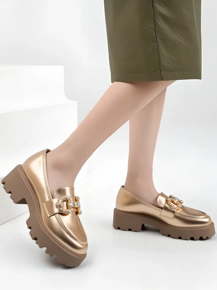 Eleganckie i błyszczące damskie mokasyny ELEGANZE CHAMPAGNE to idealne połączenie luksusu i komfortu. Wykonane z wysokiej jakości skóry ekologicznej w kolorze szampana, zdobione są złotym łańcuszkiem z błyszczącymi kamieniami, które dodają im wyjątkowego charakteru. Gruba, żłobiona podeszwa zapewnia stabilność i wygodę noszenia, czyniąc je idealnym wyborem na każdą okazję.