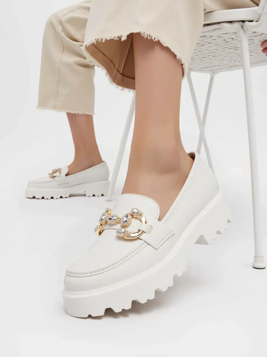 Odkryj klasykę z nowoczesnym twistem w damskich mokasynach ELEGANZE WHITE. Te wsuwane buty w czystym białym kolorze są idealne dla każdej kobiety ceniącej sobie elegancki, ale wygodny styl. Błyszcząca złota ozdoba dodaje im ekskluzywnego charakteru, a gruba, żłobiona podeszwa zapewnia komfort noszenia na każdym kroku.