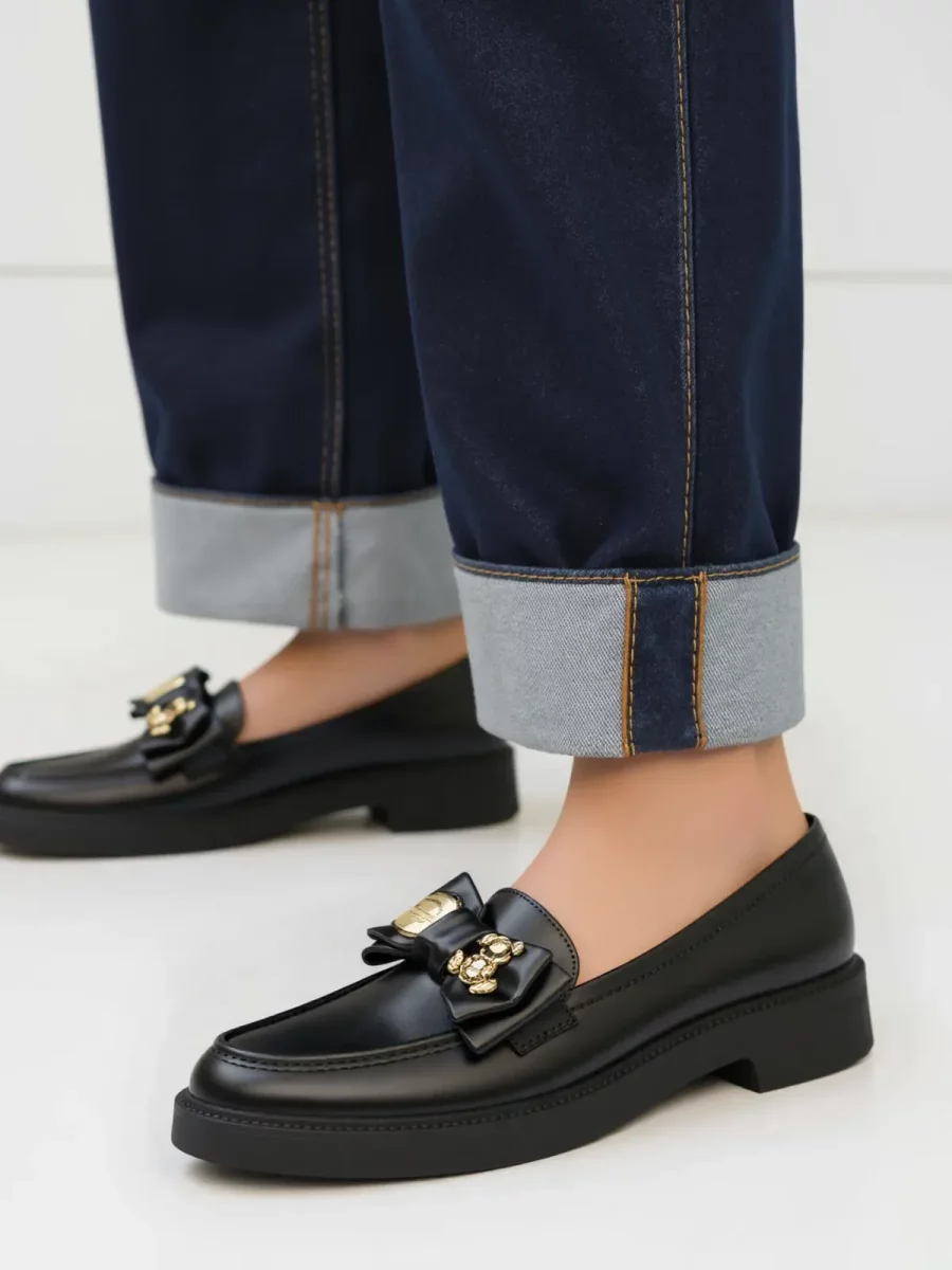 Damskie mokasyny ELYDA BLACK to elegancka propozycja dla kobiet ceniących styl i wygodę. Klasyczna czarna cholewka wykonana z wysokiej jakości ekoskóry, osadzona na stabilnej podeszwie, gwarantuje komfort noszenia. Efektowna kokarda z dekoracyjnymi złotymi elementami dodaje im luksusowego charakteru, czyniąc je doskonałym wyborem zarówno na co dzień, jak i na wyjątkowe okazje.