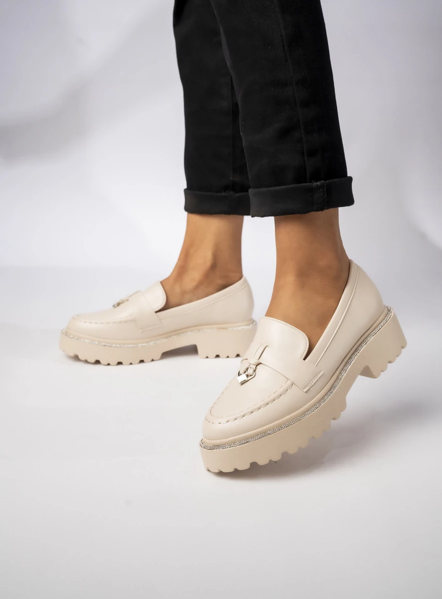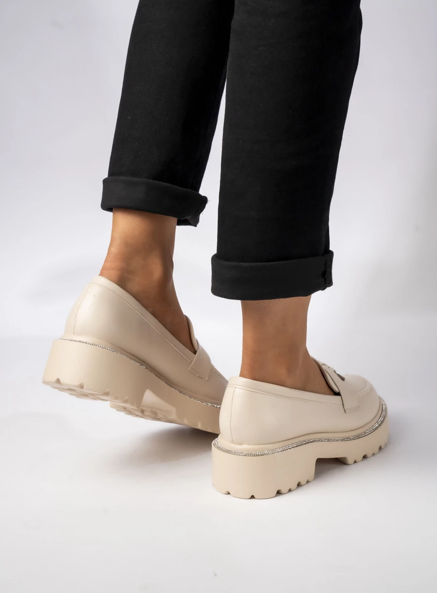 Mokasyny Valeria BEIGE PU to elegancka propozycja dla kobiet ceniących styl i wygodę. Wykonane z wysokiej jakości kremowej eko skóry, łączą klasyczny fason z nowoczesnym wykończeniem. Gruba, bieżnikowana podeszwa zapewnia komfort i stabilność, a subtelne zdobienia cyrkoniami dodają butom wyjątkowego charakteru. Idealnie komponują się zarówno z casualowymi stylizacjami, jak i eleganckimi zestawami, nadając im szykownego akcentu.