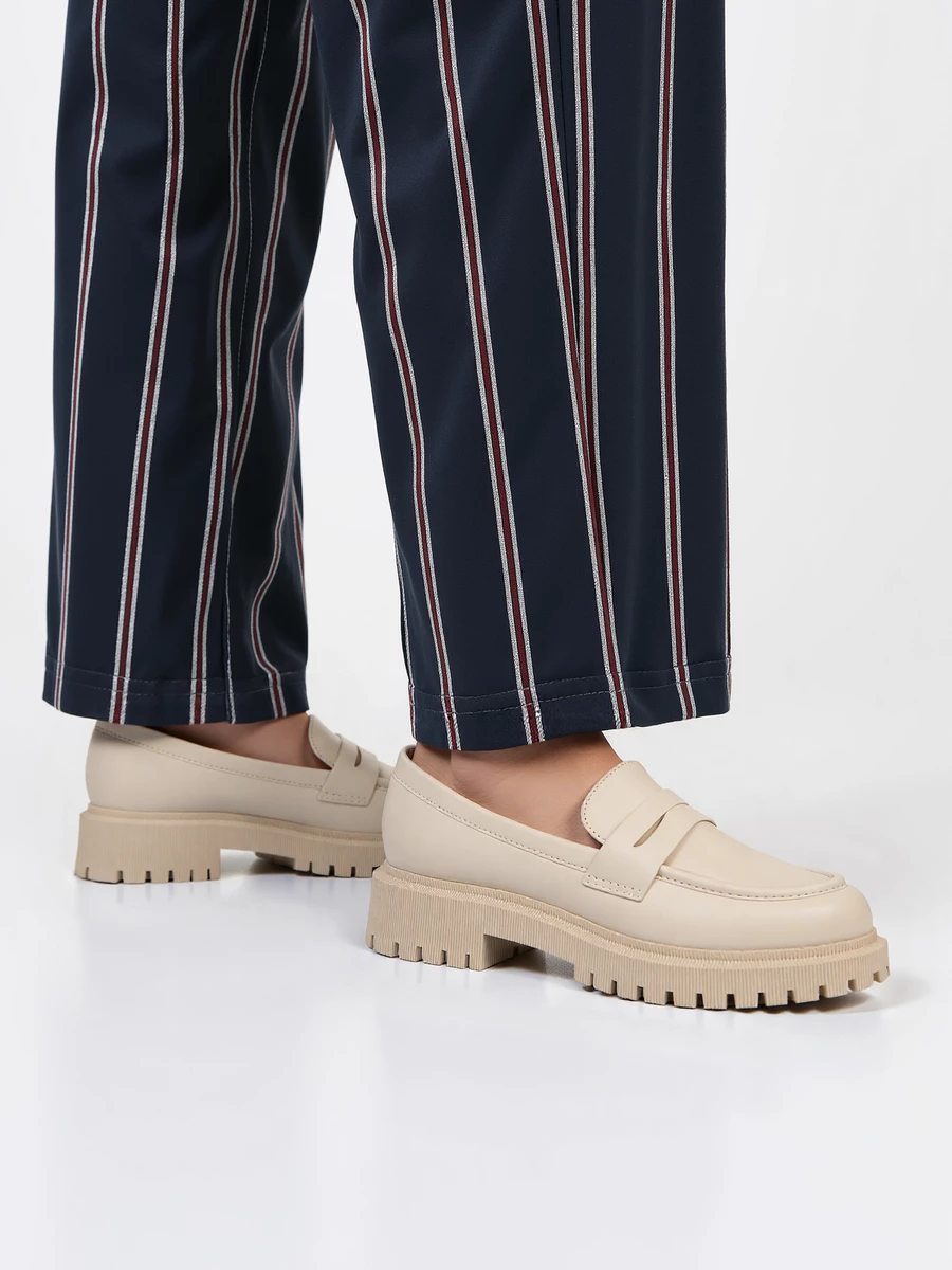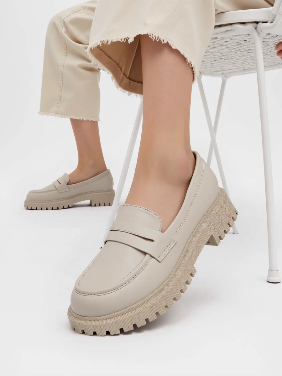 Damskie Mokasyny LAURA BEIGE to nowoczesna odsłona klasycznego fasonu. Gładka, beżowa cholewka z ekoskóry utrzymana w minimalistycznym stylu sprawia, że buty pasują zarówno do casualowych, jak i bardziej eleganckich stylizacji. Masywna podeszwa nadaje im nieco surowego charakteru, a jednocześnie zapewnia wygodę noszenia na co dzień. Wsuwana konstrukcja ułatwia szybkie zakładanie, dzięki czemu mokasyny staną się niezastąpionym elementem Twojej garderoby.