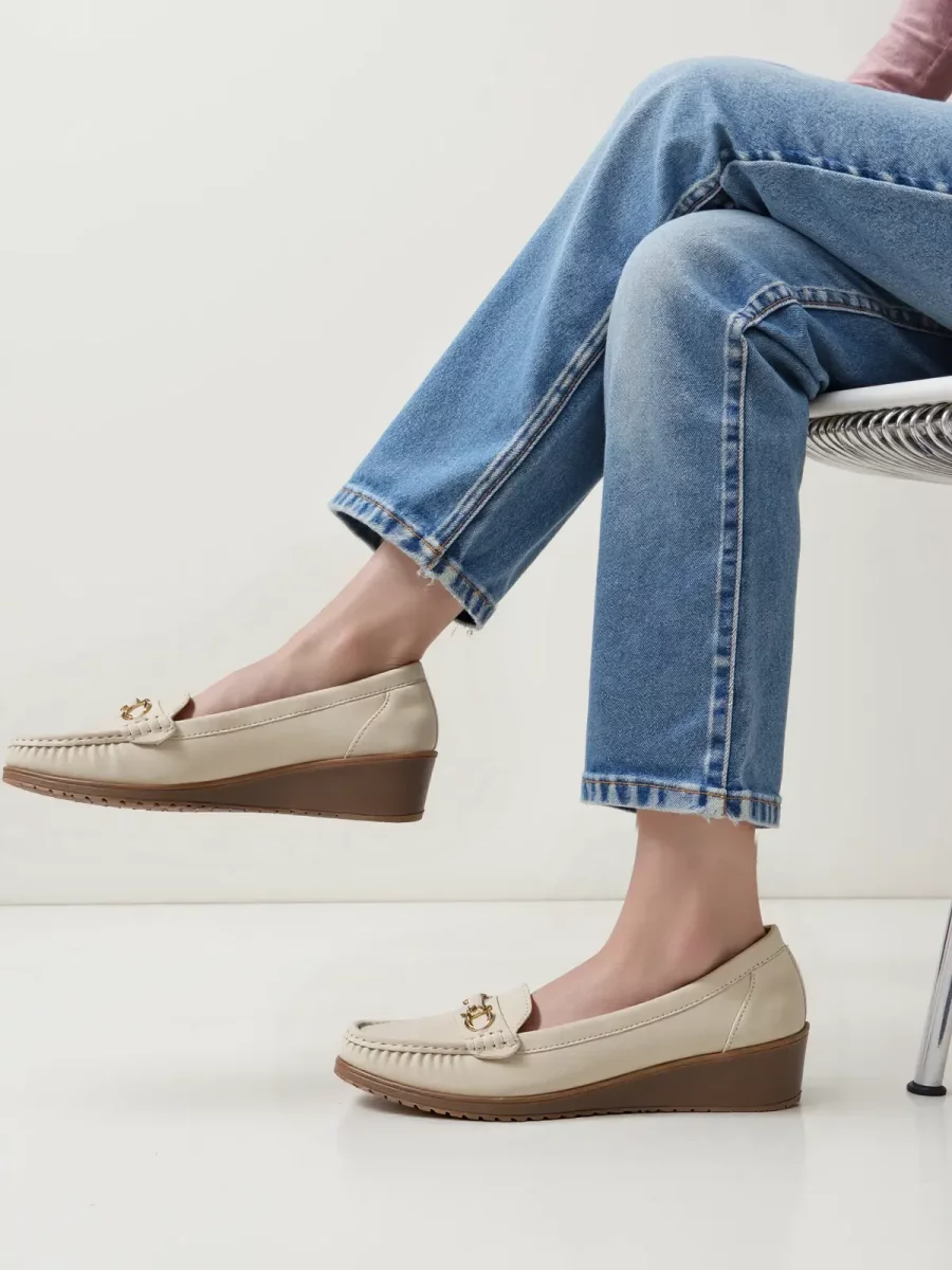 Damskie mokasyny MIRENA w eleganckim beżowym kolorze to stylowe i wygodne obuwie na co dzień. Delikatna ozdoba w postaci złotego akcentu na przodzie nadaje im klasy, a podwyższona koturna zapewnia komfort noszenia. Idealne do biurowych stylizacji oraz eleganckich, miejskich outfitów.