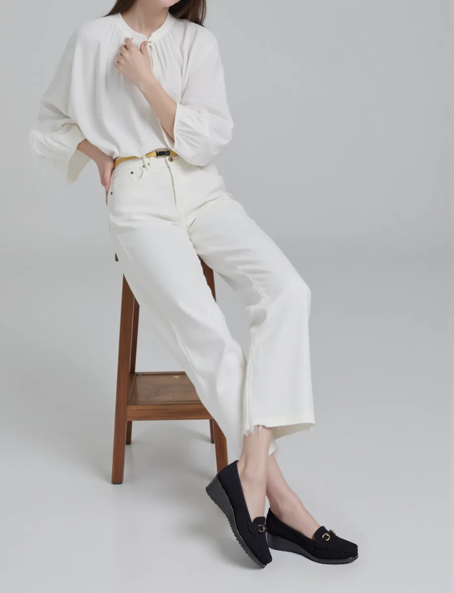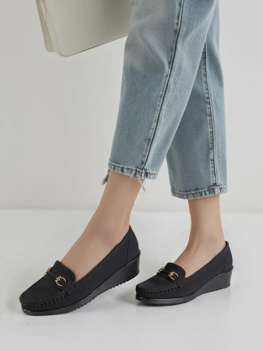 Damskie mokasyny MIRENA w eleganckim czarnym kolorze to doskonałe połączenie stylu i wygody. Złota ozdoba na przodzie dodaje im klasy, a podwyższona koturna zapewnia komfort przez cały dzień. Idealne do biura, eleganckich stylizacji oraz codziennego użytkowania.