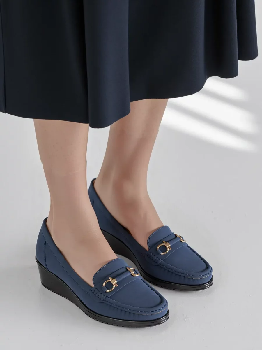 Damskie mokasyny MIRENA w stylowym niebieskim odcieniu to idealny wybór dla kobiet ceniących elegancję i wygodę. Klasyczny design z subtelną złotą ozdobą na przodzie nadaje im szyku, a podwyższona koturna zapewnia komfort noszenia przez cały dzień. Doskonale sprawdzą się zarówno w eleganckich, jak i codziennych stylizacjach.