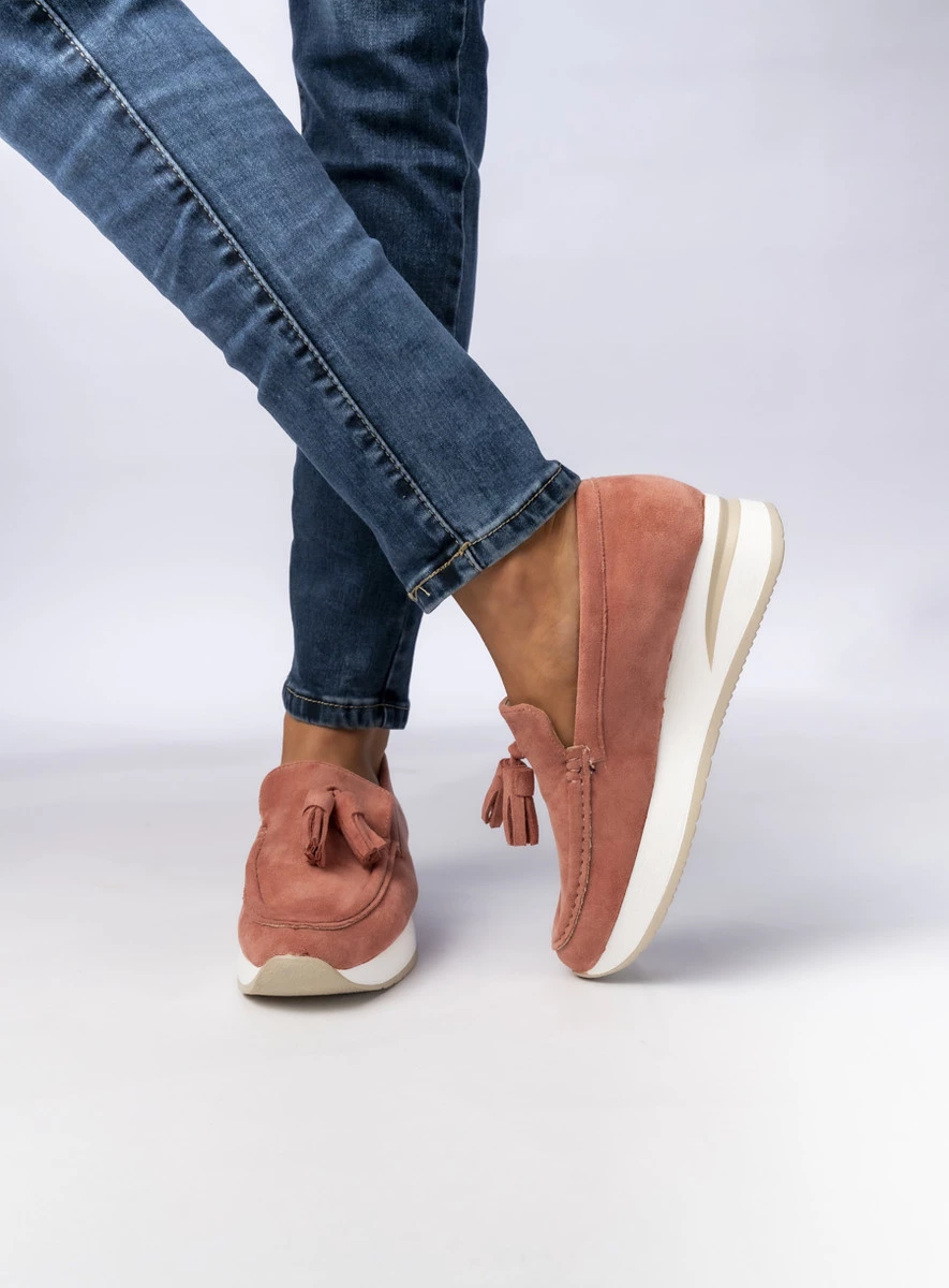 Damskie mokasyny na platformie w eleganckim odcieniu pudrowego różu. Wykonane z wysokiej jakości zamszu, zapewniają miękkość i komfort użytkowania. Model wyróżnia się modnymi frędzlami na przodzie oraz lekką, elastyczną podeszwą, która dodaje im nowoczesnego charakteru. Idealne do codziennych oraz eleganckich stylizacji.