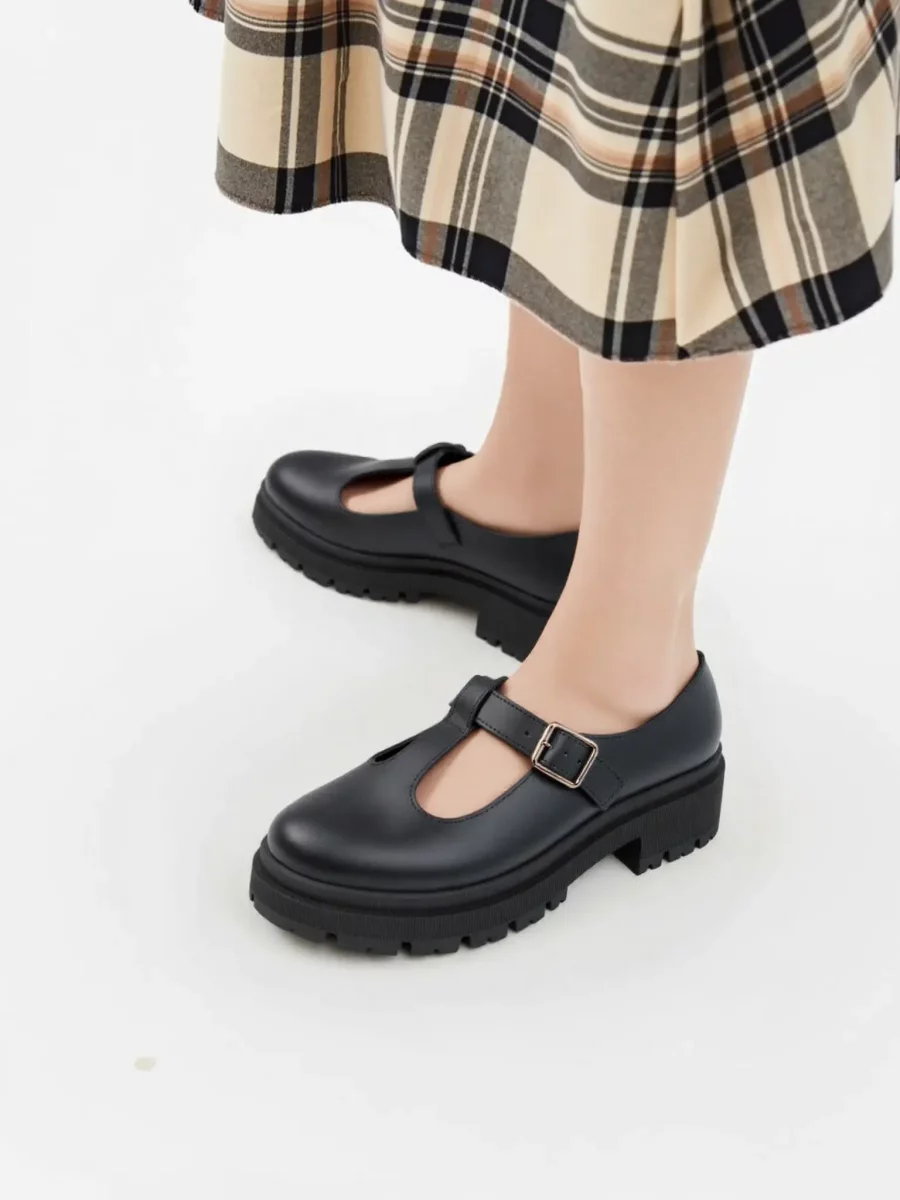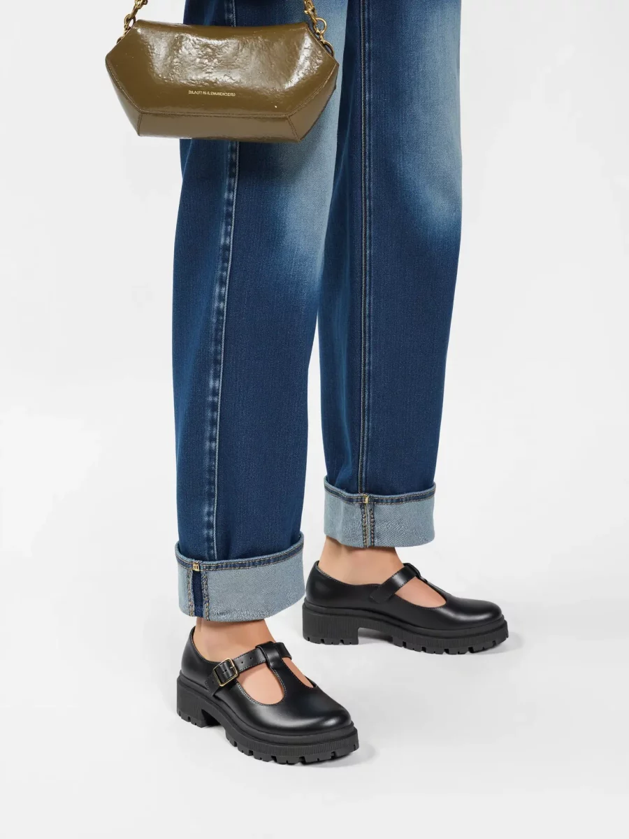Damskie półbuty MARGOT BLACK to modny wybór dla kobiet ceniących połączenie stylu i wygody. Klasyczny czarny kolor oraz elegancka klamra nadają im wyrafinowanego charakteru, dzięki czemu sprawdzą się zarówno w codziennych, jak i bardziej eleganckich stylizacjach. Gruba podeszwa dodaje butom nieco rockowego stylu, a jednocześnie zapewnia komfort noszenia. Wykonane z wysokiej jakości skóry ekologicznej, gwarantują trwałość i wygodę na co dzień.