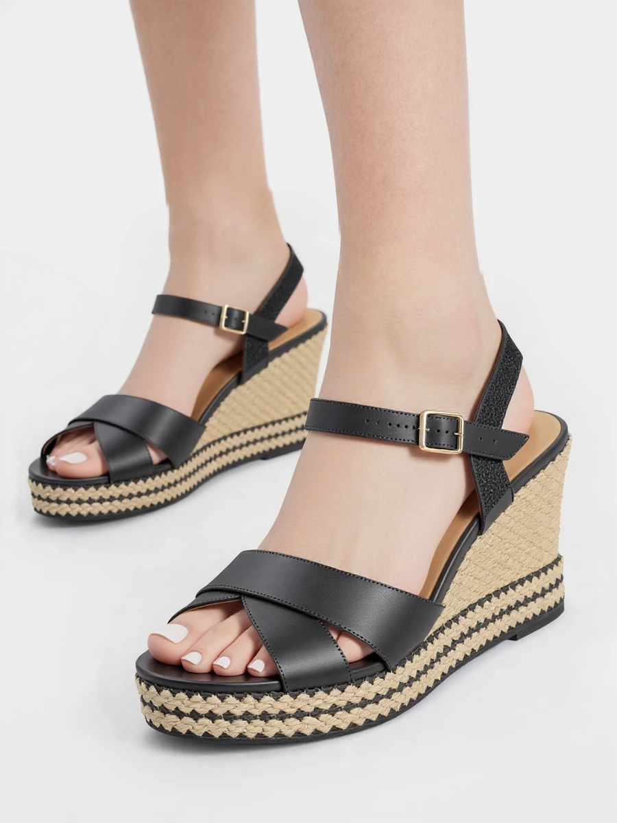 Damskie Sandały ARLETTE BLACK to połączenie ponadczasowej elegancji z letnią swobodą. Krzyżujące się paski z gładkiej ekoskóry stabilnie trzymają stopę, a pleciona koturna nadaje całości naturalnego, wakacyjnego charakteru. Lekka platforma i stabilny obcas zapewniają wygodę przez cały dzień, a pasek z regulowaną klamerką gwarantuje idealne dopasowanie. Model ten sprawdzi się zarówno w stylizacjach na co dzień, jak i podczas letnich wyjazdów.