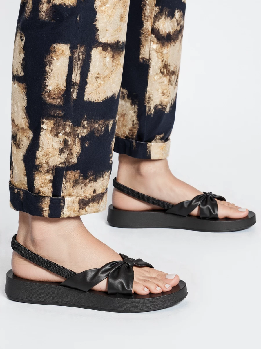 Klapki BOWLINE w kolorze czarnym (czarne) charakteryzują się eleganckim i modnym designem. Wyróżniają się asymetrycznym paskiem z subtelnym kokardą, która dodaje im romantycznego uroku. Dzięki wygodnej, platformowej podeszwie oraz elastycznemu zapięciu na plecionym pasku, klapki te zapewniają komfort i stabilność. Idealne na letnie spacery, spotkania w gronie przyjaciół lub relaks na plaży.