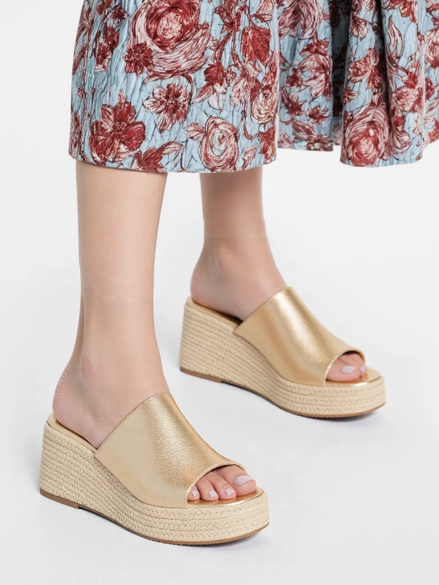 Sandały LORRAINE w kolorze GOLD (złoty) to elegancka propozycja na letnie dni. Wierzch butów wykonany z materiału o metalicznym wykończeniu nadaje im subtelnego blasku. Podeszwa w kształcie platformy i pleciona część z juty zapewniają wygodę i stabilność przez cały dzień. Doskonale pasują do eleganckich stylizacji, a także na letnie wyjścia na miasto czy wakacje.