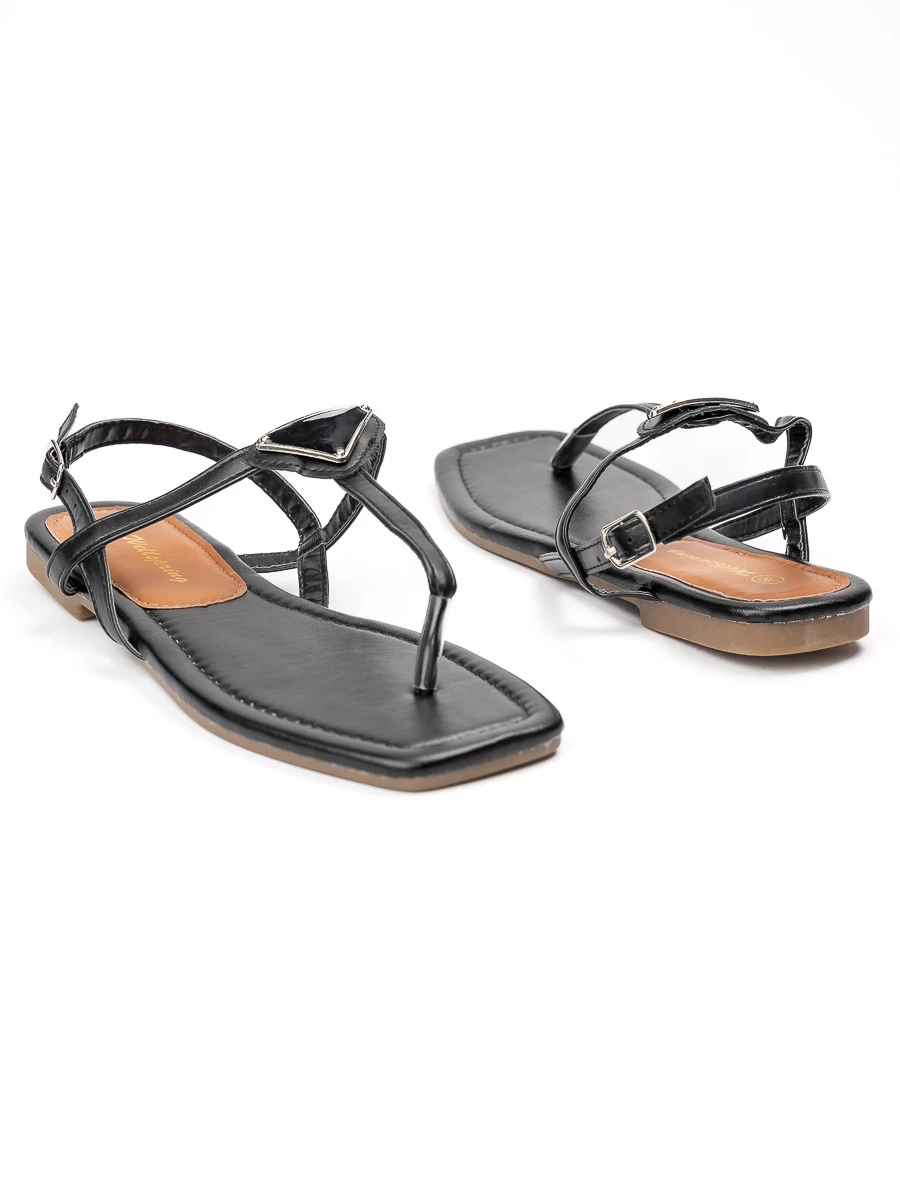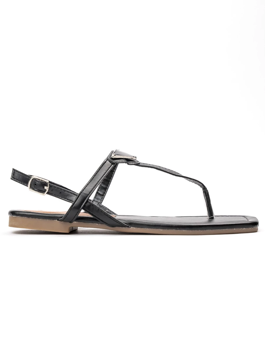 Damskie Sandały RAVEN BLACK to modna interpretacja klasycznych japonek w eleganckim, minimalistycznym wydaniu. Cienkie paski wykonane z połyskującej ekoskóry w kolorze czarnym subtelnie oplatają stopę, a geometryczne przeszycia i kwadratowy nosek dodają nowoczesności. Niski obcas i płaska, elastyczna podeszwa zapewniają wygodę podczas noszenia. Idealne na lato – do sukienek, lnianych spodni czy stylizacji boho.