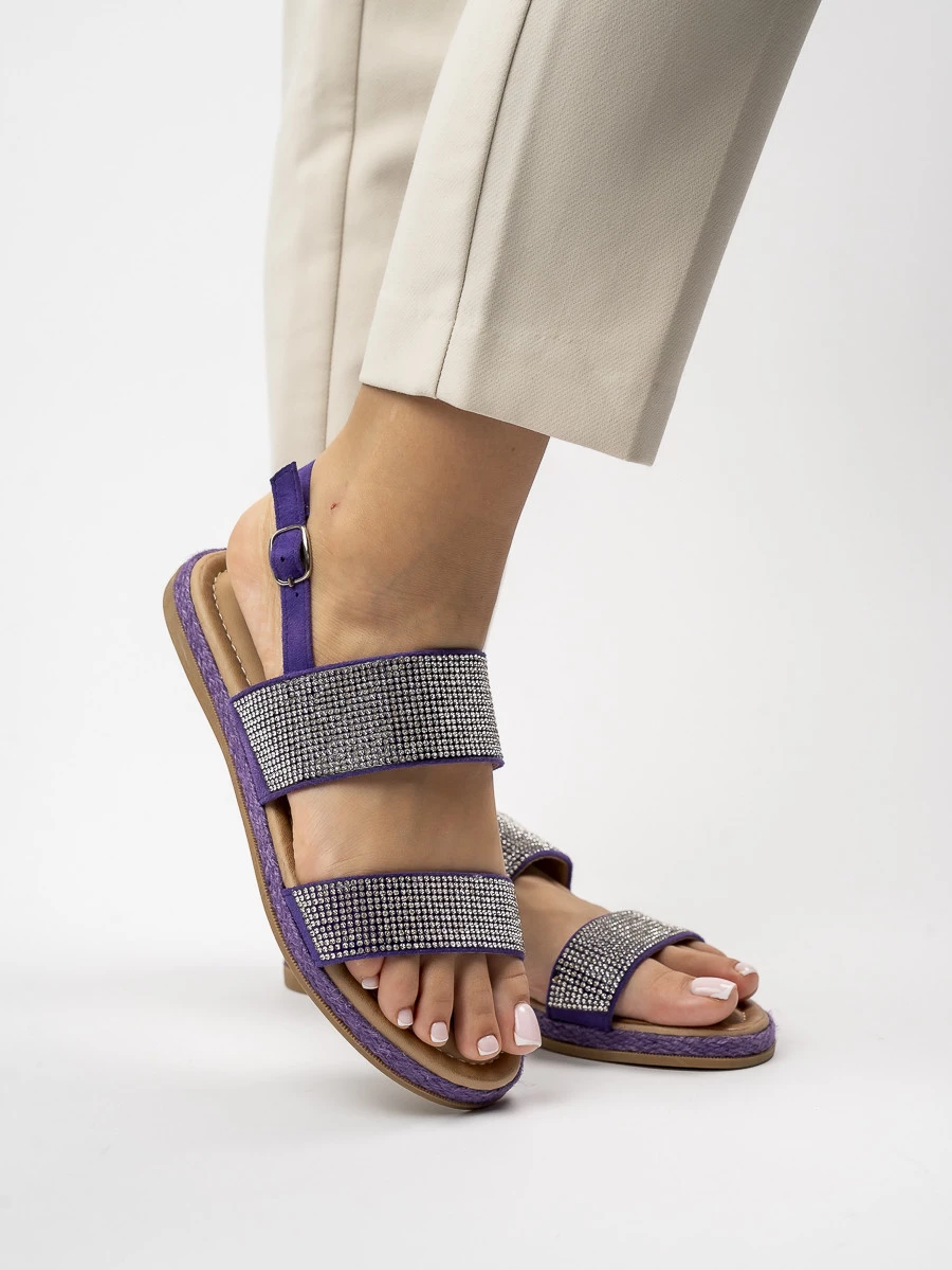 Sandały Viona w kolorze fioletowym (PURPLE) to propozycja dla kobiet ceniących modny akcent w codziennym obuwiu. Ozdobne paski z błyszczącymi kryształkami doskonale komponują się z letnimi stylizacjami. Regulowany pasek na pięcie zapewnia dobre dopasowanie, a płaska, elastyczna podeszwa gwarantuje wygodę użytkowania. Świetne na spacery, wakacje i nieformalne spotkania.