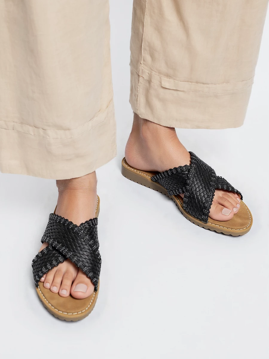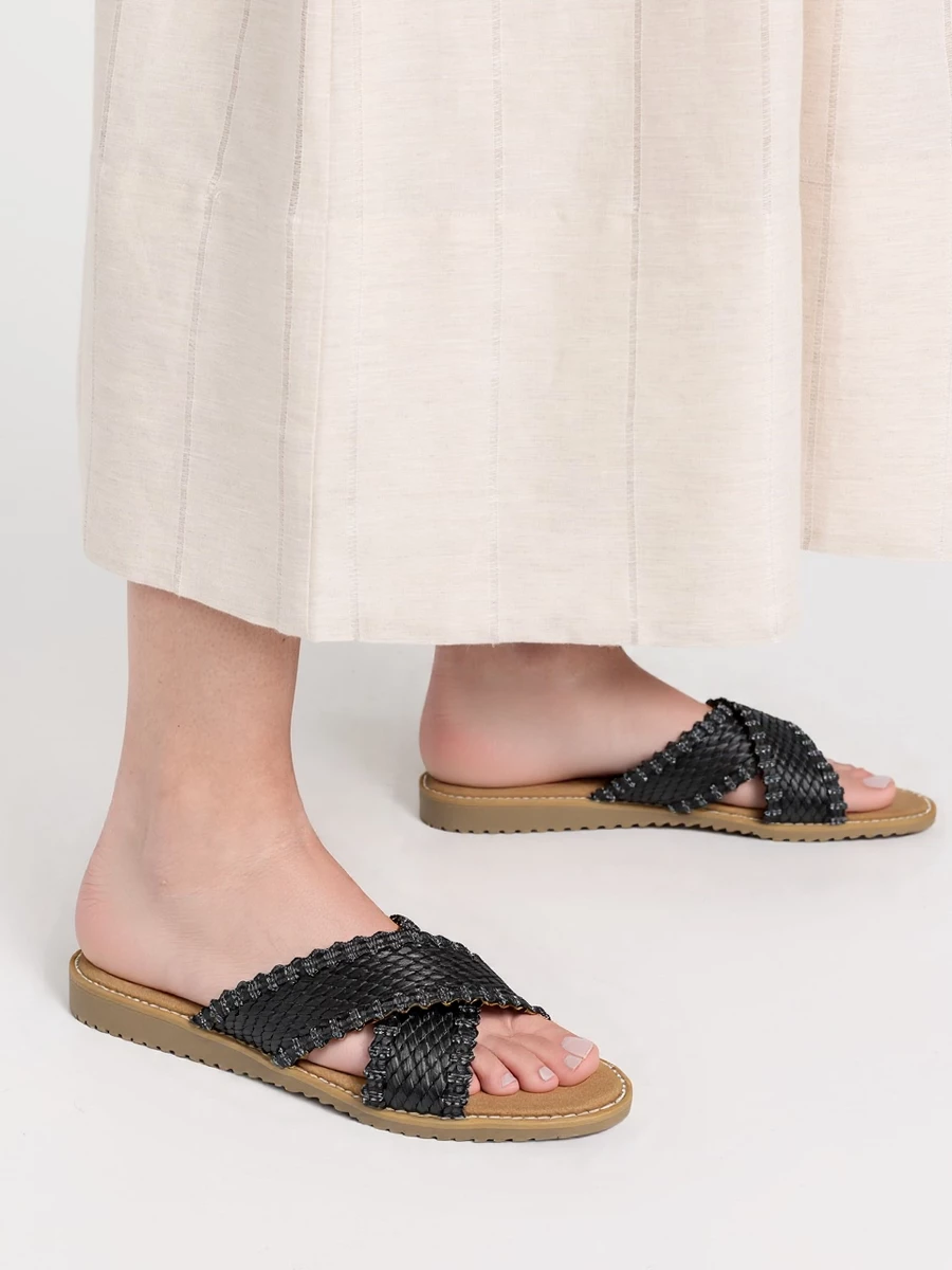 Klapki WAVE w kolorze czarnym to definicja wakacyjnej elegancji w swobodnym stylu. Plecione paski w odcieniu głębokiej czerni dodają lekkości i świeżości każdej letniej stylizacji, a miękka wkładka zadba o komfort nawet podczas najdłuższych spacerów.