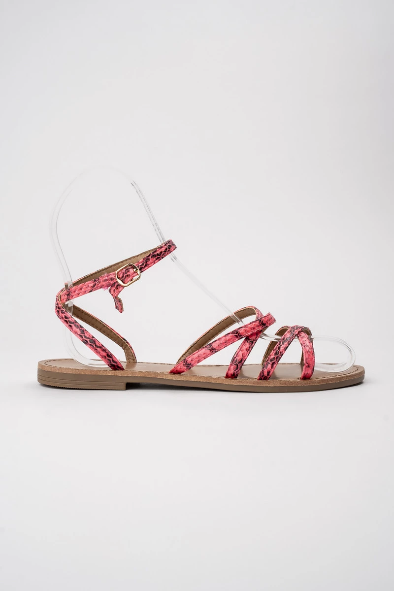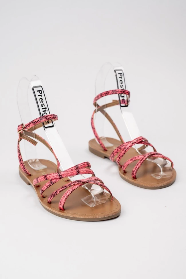 Damskie Sandały ZAYA PINK to wyjątkowe połączenie lekkości i stylu z wakacyjnym pazurem. Cienkie paski w różowym odcieniu z wężowym wzorem efektownie oplatają stopę, tworząc modny i przewiewny fason. Regulowany pasek wokół kostki zapewnia stabilność, a płaska podeszwa komfort przez cały dzień. To idealny model na letnie spacery, wakacyjne wyjazdy czy miejskie stylizacje w cieplejsze dni.