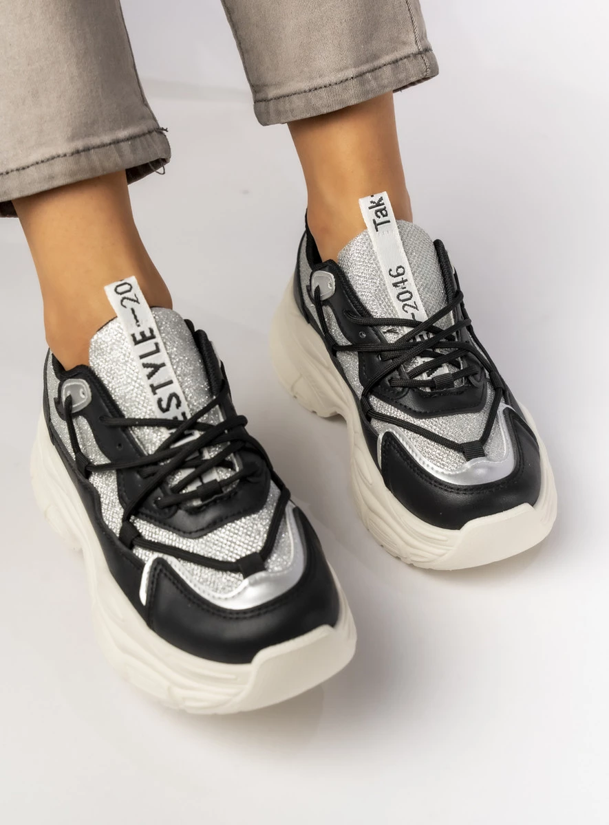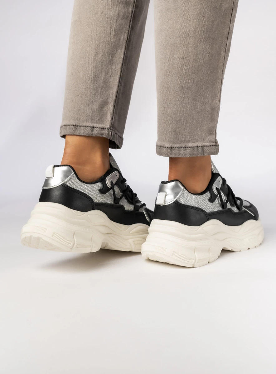 Stylowe damskie sneakersy na grubej platformie w eleganckiej czerni. Ich sportowy charakter łączy się z nowoczesnym designem, tworząc idealne obuwie na co dzień. Wygodna, amortyzująca podeszwa zapewnia komfort noszenia przez cały dzień, a kontrastowe detale dodają im charakteru. Model doskonały zarówno do casualowych, jak i sportowych stylizacji.
