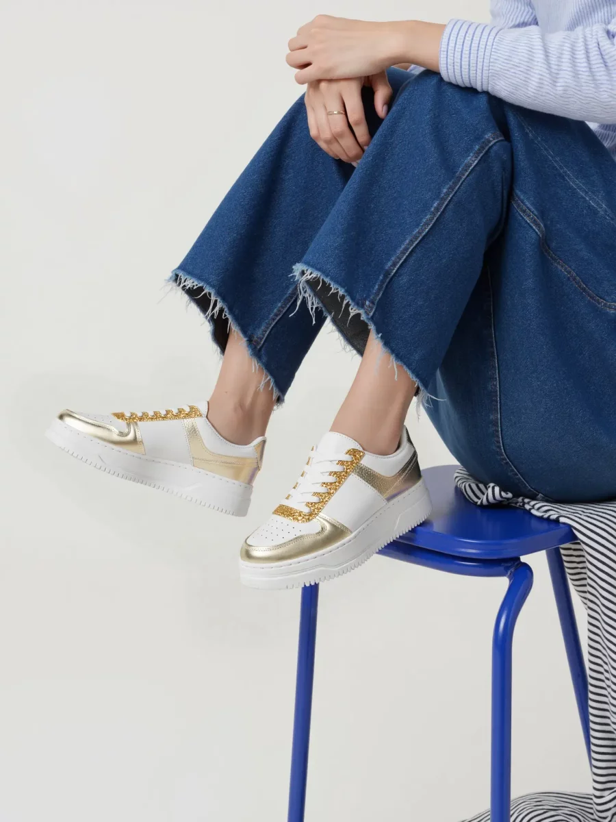 Damskie sneakersy ASTRYA GOLD to wyjątkowe połączenie stylu i wygody. Klasyczna biała cholewka ozdobiona złotymi metalicznymi wstawkami oraz brokatowymi detalami nadaje butom luksusowego charakteru. Dzięki solidnej platformie zapewniają komfort noszenia przez cały dzień. Idealnie sprawdzą się zarówno w sportowych, jak i eleganckich stylizacjach.