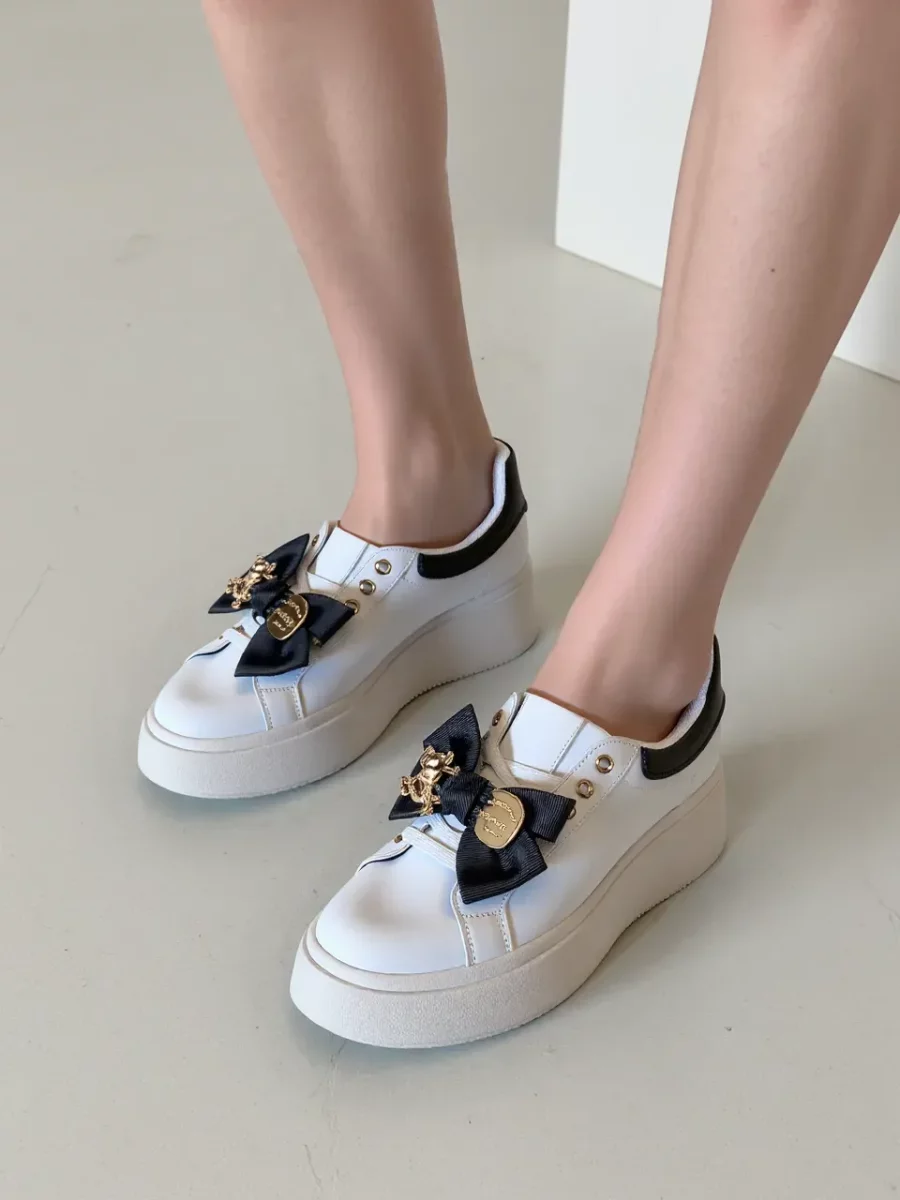 Damskie sneakersy CHARM BLACK to idealne połączenie elegancji i sportowego stylu. Biała kolorystyka i ozdobne detale, takie jak duża kokarda oraz złote akcenty, nadają im unikalny charakter. Wykonane z wysokiej jakości skóry ekologicznej, gwarantują komfort noszenia przez cały dzień. Solidna platformowa podeszwa dodaje kilku centymetrów wzrostu i zapewnia wygodę podczas chodzenia. Idealne do casualowych stylizacji, jak i bardziej eleganckich zestawów.