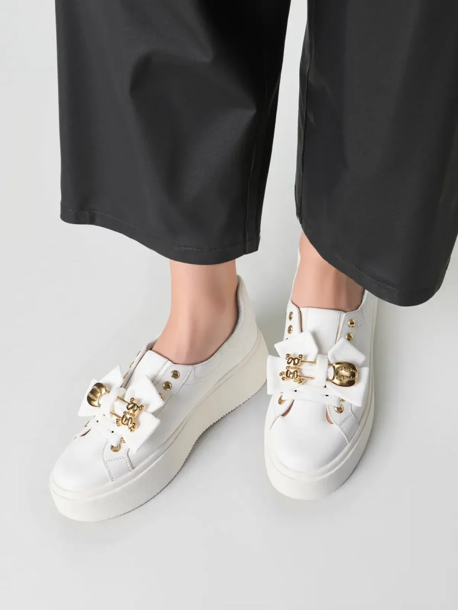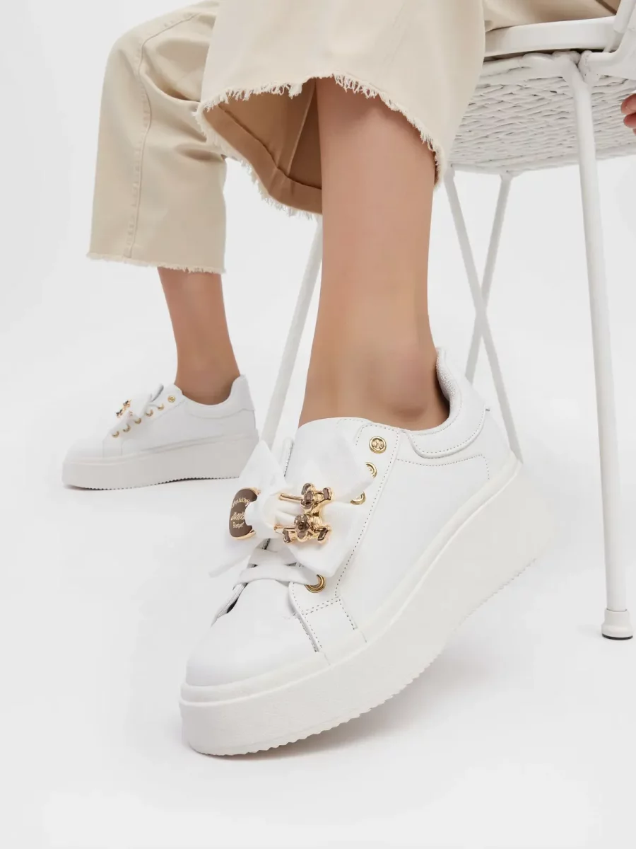 Damskie sneakersy CHARM WHITE to idealne połączenie elegancji i sportowego stylu. Biała kolorystyka i ozdobne detale, takie jak duża kokarda oraz złote akcenty, nadają im unikalny charakter. Wykonane z wysokiej jakości skóry ekologicznej, gwarantują komfort noszenia przez cały dzień. Solidna platformowa podeszwa dodaje kilku centymetrów wzrostu i zapewnia wygodę podczas chodzenia. Idealne do casualowych stylizacji, jak i bardziej eleganckich zestawów.