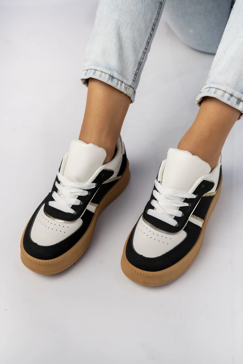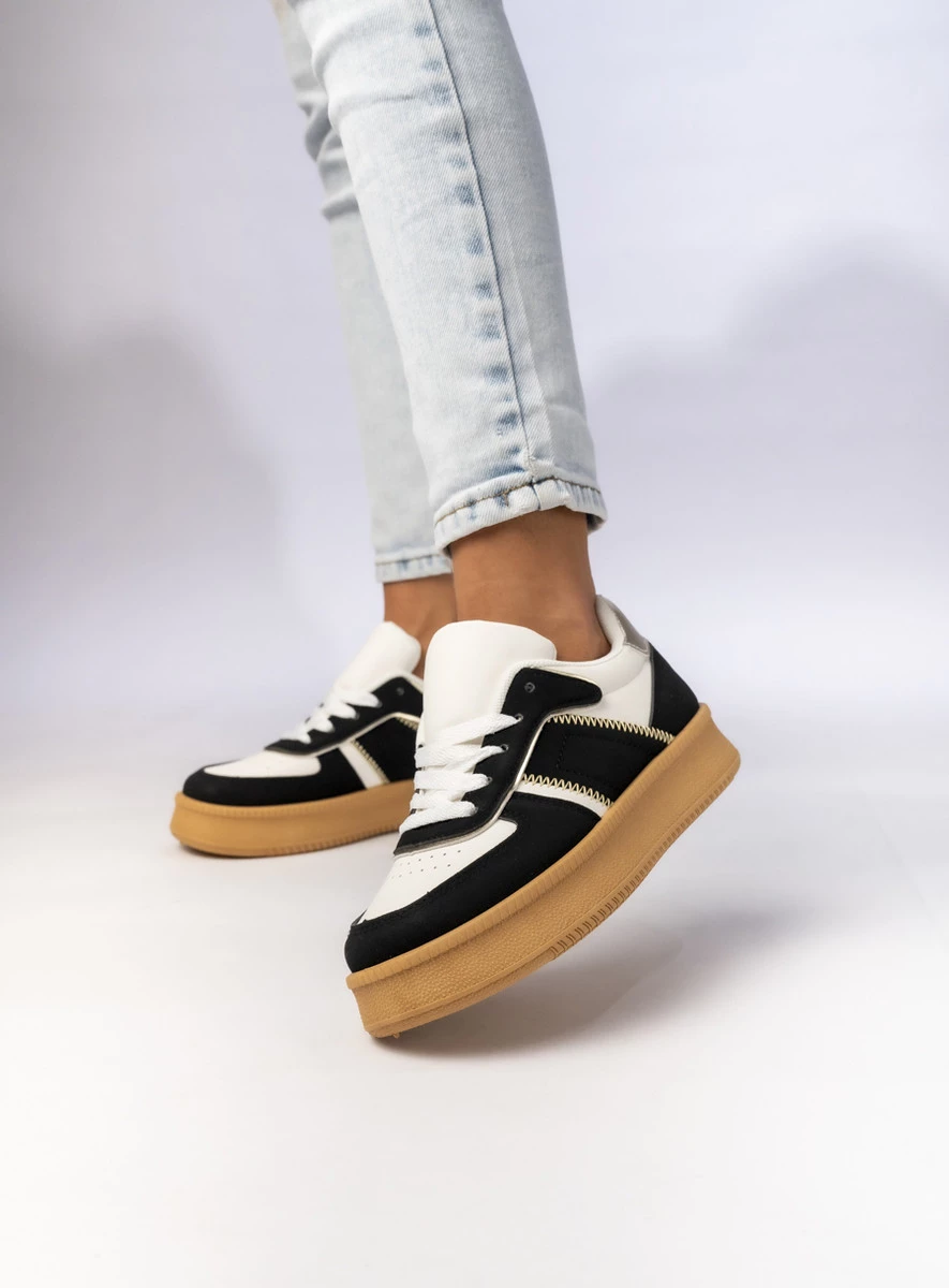 DULXO BLACK to nowoczesne sneakersy, które łączą klasyczną elegancję z miejskim stylem. Ich czarno-biała cholewka w połączeniu z beżową, gumową podeszwą tworzy efektowny kontrast, który podkreśla każdą stylizację. Idealne do codziennych outfitów, zapewniają wygodę i trwałość dzięki starannie dobranym materiałom. Doskonały wybór dla kobiet ceniących komfort i modny wygląd.
