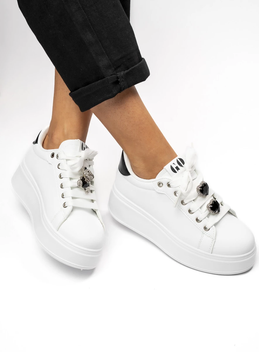 GLAM BEAR White/Black to eleganckie sneakersy na platformie, łączące klasyczną biel z kontrastującymi czarnymi akcentami. Charakterystyczna ozdoba w kształcie misia z kryształkami dodaje im ekskluzywnego wyglądu. Idealne zarówno na co dzień, jak i do modnych stylizacji.