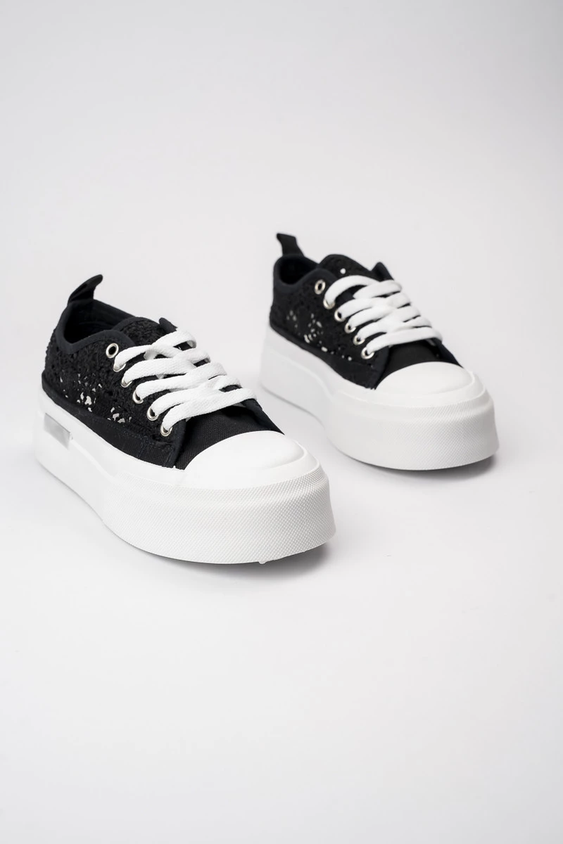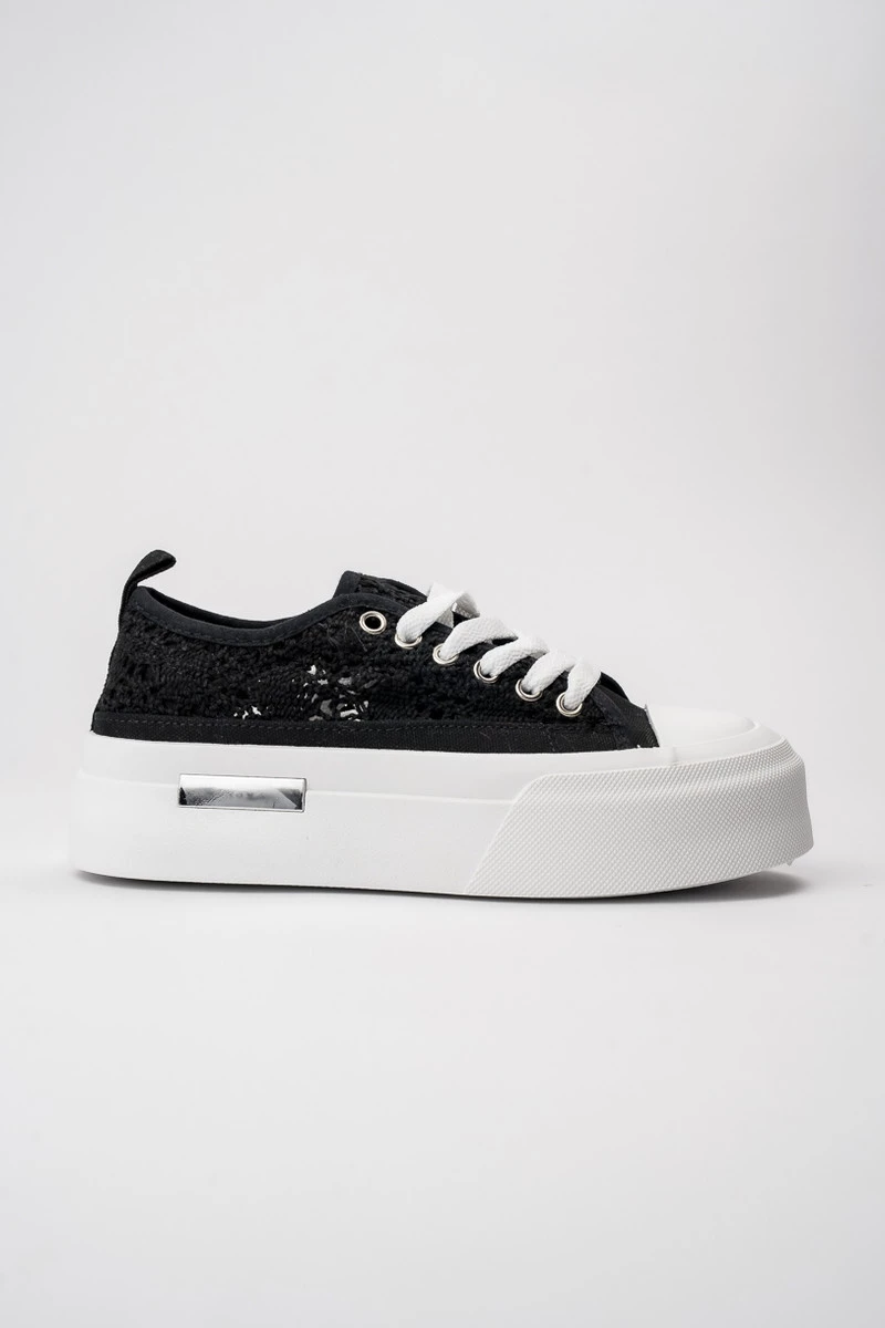 Szukasz sneakersów damskich, które są wygodne jak trampki, ale wyglądają jak stylowy dodatek? LACE BLACK to dokładnie ten model! Czarna, ażurowa cholewka z delikatnym połyskiem dodaje lekkości i kobiecego charakteru, a gruba biała platforma optycznie wydłuża nogi i świetnie sprawdza się w codziennym użytkowaniu.