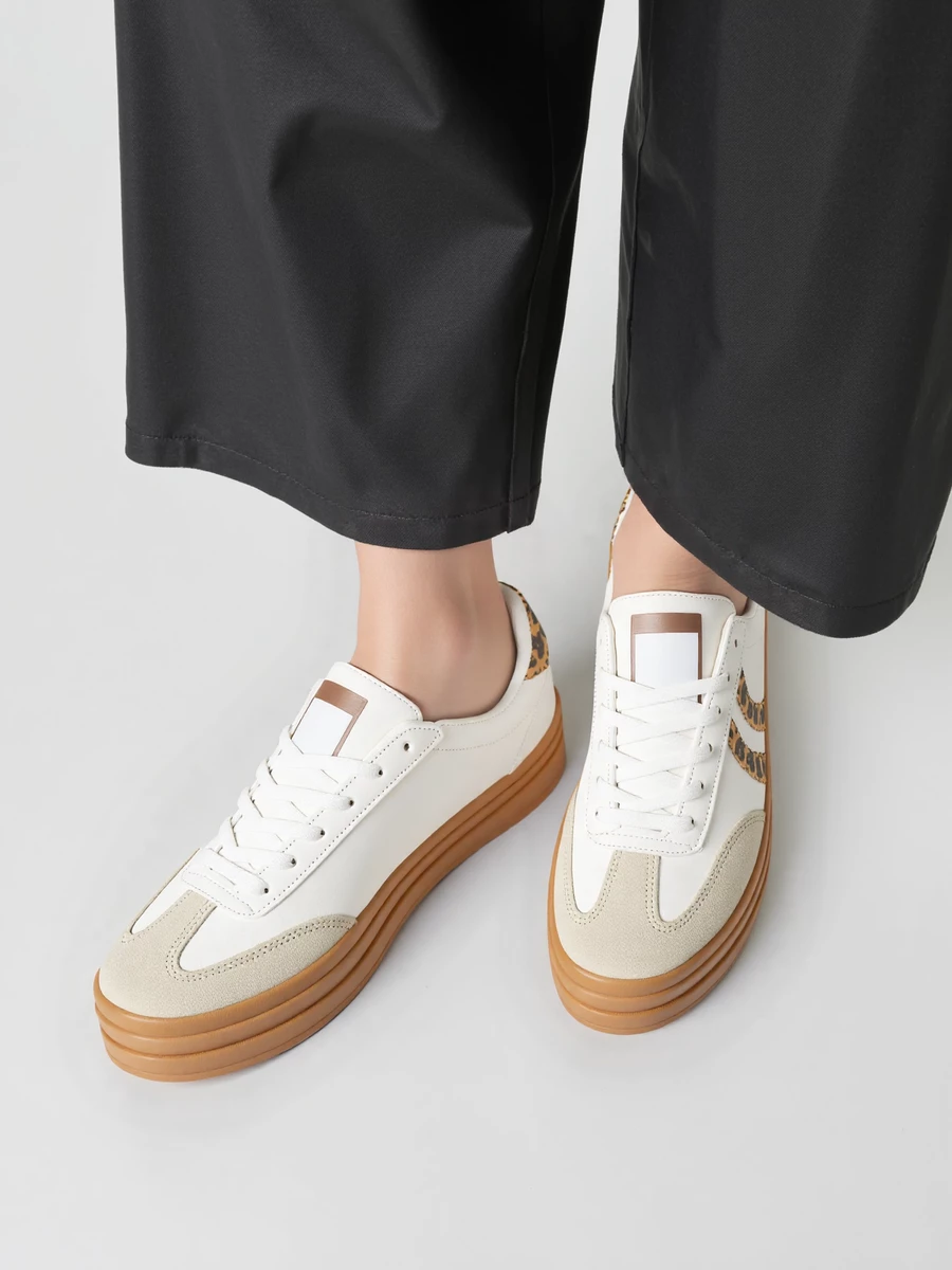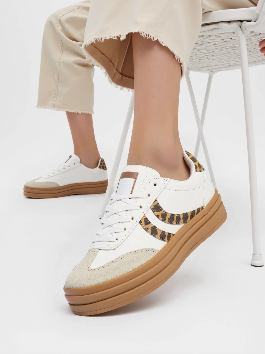Damskie sneakersy LUMI Leopard to propozycja dla kobiet, które pragną wyróżnić się oryginalnym stylem, łącząc sportową wygodę z odważnym, modnym designem. Wzór leopard nadaje butom wyrazisty charakter, dzięki czemu stanowią niebanalny akcent każdej stylizacji – od codziennych zestawów po awangardowe outfity. Wyższa, gumowa podeszwa gwarantuje komfort, amortyzację oraz stabilność, dodając jednocześnie pewności siebie.