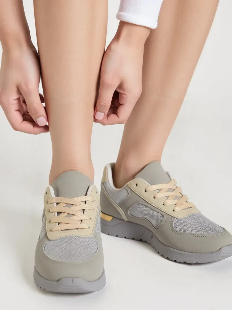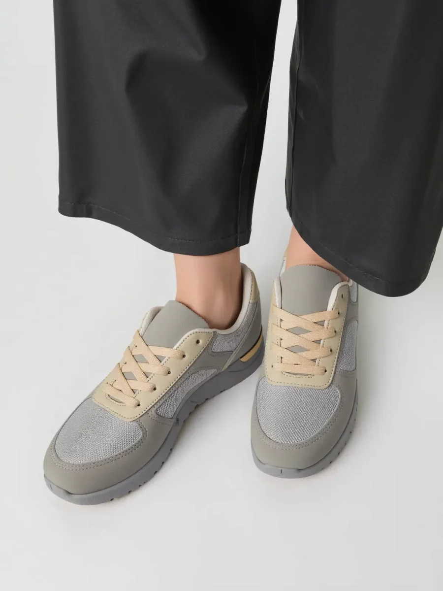 Damskie sneakersy LUMINA GREY to eleganckie buty sportowe w stonowanej kolorystyce, idealne do codziennych stylizacji. Cholewka wykonana z połączenia skóry ekologicznej i przewiewnej siateczki, zapewnia doskonałą wentylację i wygodę. Beżowe i szare akcenty nadają im subtelnego, minimalistycznego wyglądu, a złoty detal na pięcie dodaje odrobiny elegancji. Lekka, amortyzująca podeszwa gwarantuje komfort nawet przy długim użytkowaniu.