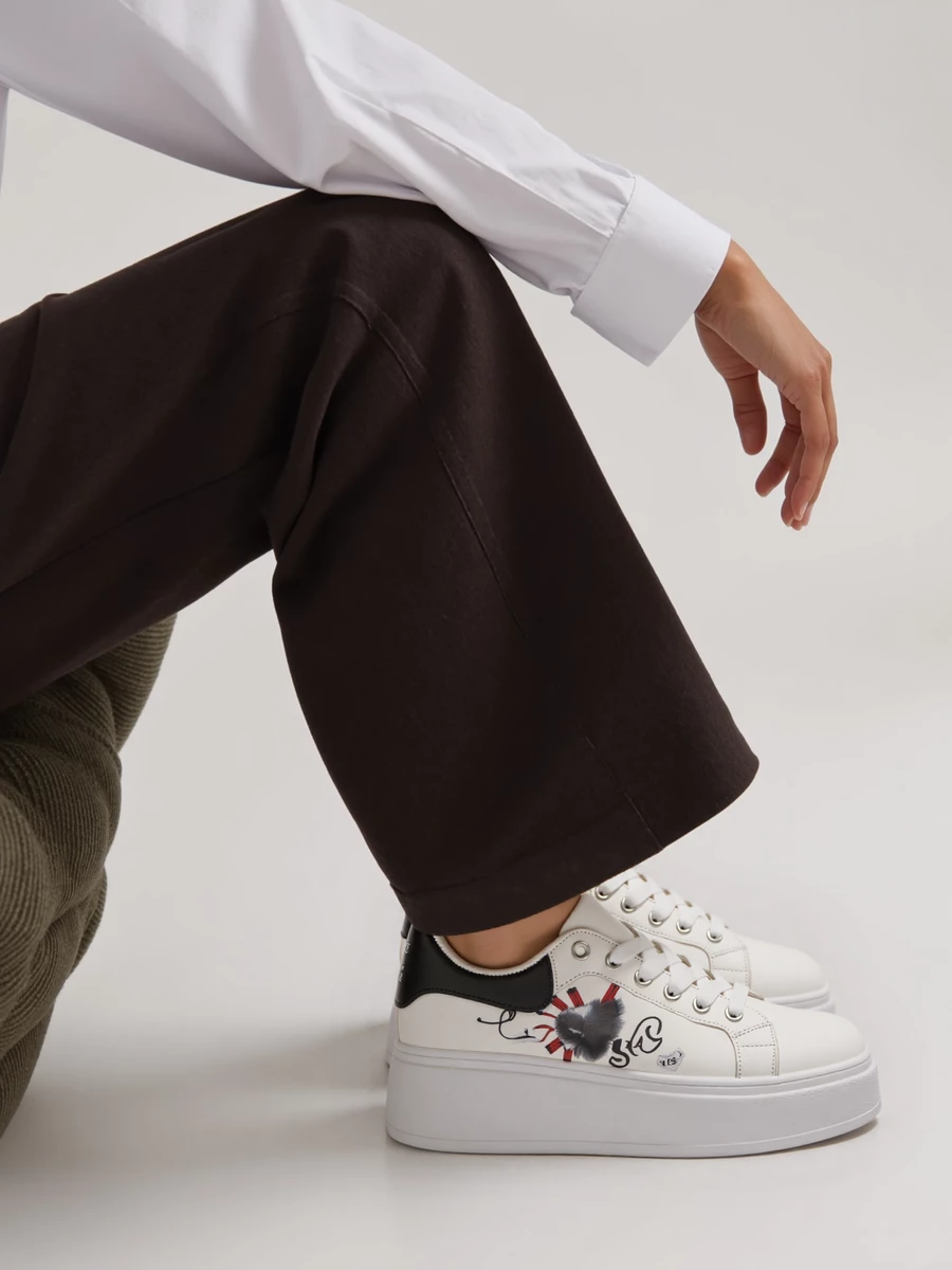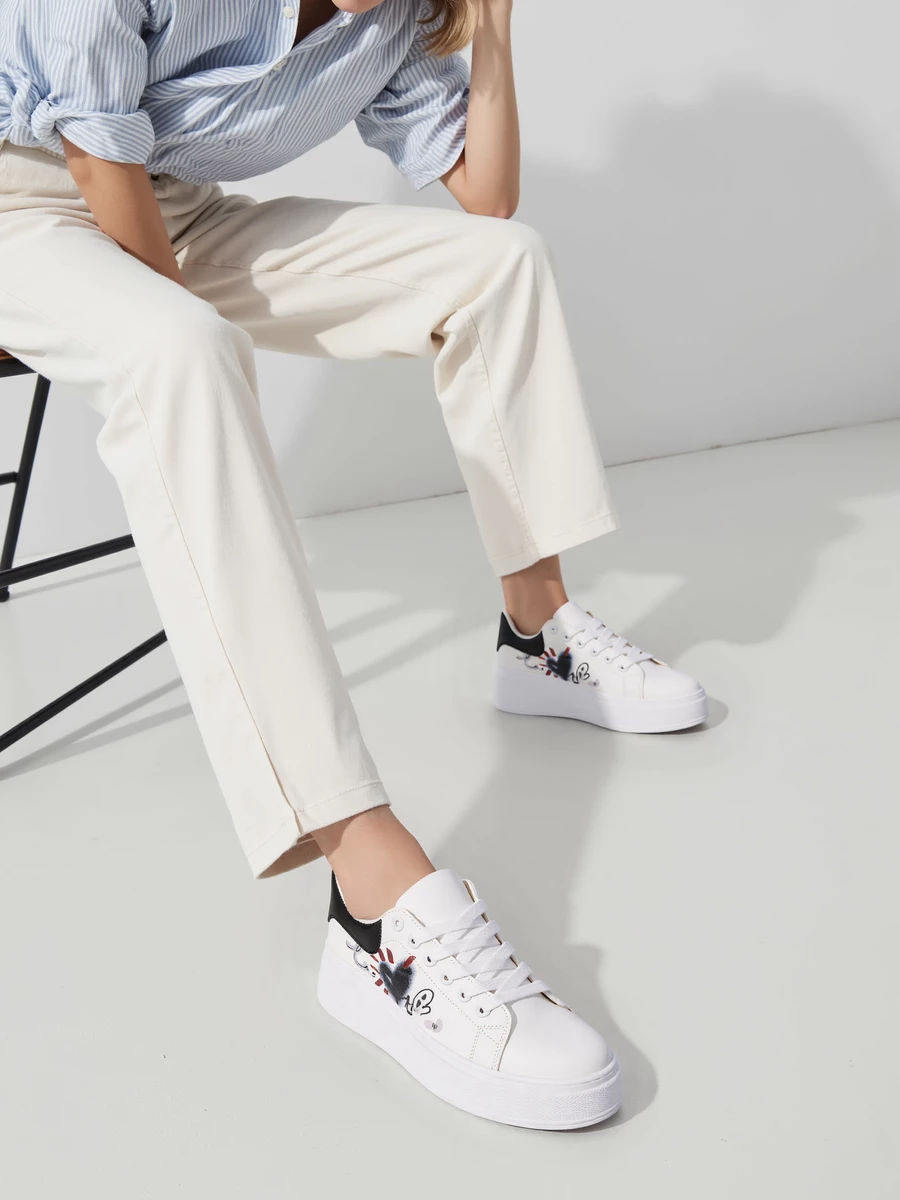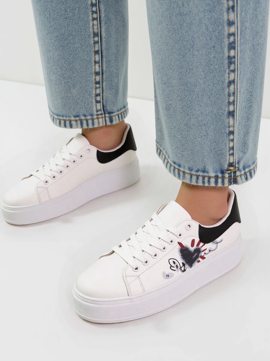 Damskie sneakersy LUMIX BLACK to połączenie nowoczesnego stylu i wygody. Klasyczna biała cholewka ozdobiona unikalnym nadrukiem oraz kontrastowym czarnym detalem na pięcie nadaje butom wyjątkowego charakteru. Podwyższona, solidna podeszwa gwarantuje komfort noszenia i subtelnie podkreśla sylwetkę. Klasyczne sznurowanie zapewnia idealne dopasowanie, a uniwersalny design sprawia, że sneakersy świetnie komponują się zarówno z codziennymi, jak i streetwearowymi stylizacjami.