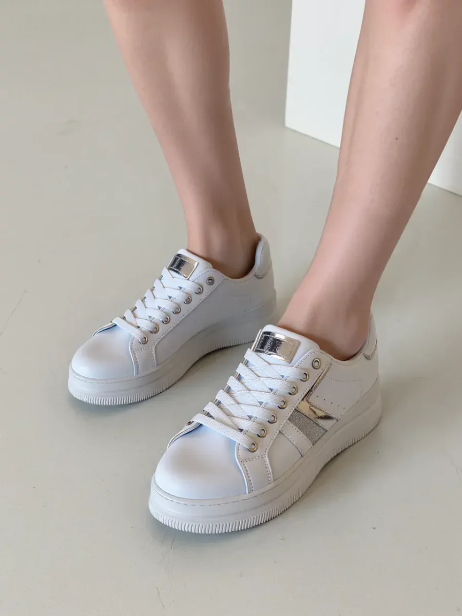 Damskie sneakersy LUXARIA SILVER to elegancka propozycja dla kobiet ceniących połączenie stylu i komfortu. Klasyczna biała cholewka wykonana z gładkiej skóry ekologicznej została ozdobiona srebrnymi detalami i błyszczącymi wstawkami, które nadają butom nowoczesny i luksusowy wygląd. Metaliczne akcenty przy sznurowaniu oraz kontrastowe srebrne paski na bokach dodają im charakteru. Wygodna, podwyższona podeszwa gwarantuje komfort przez cały dzień, czyniąc ten model idealnym zarówno na co dzień, jak i na bardziej eleganckie okazje.